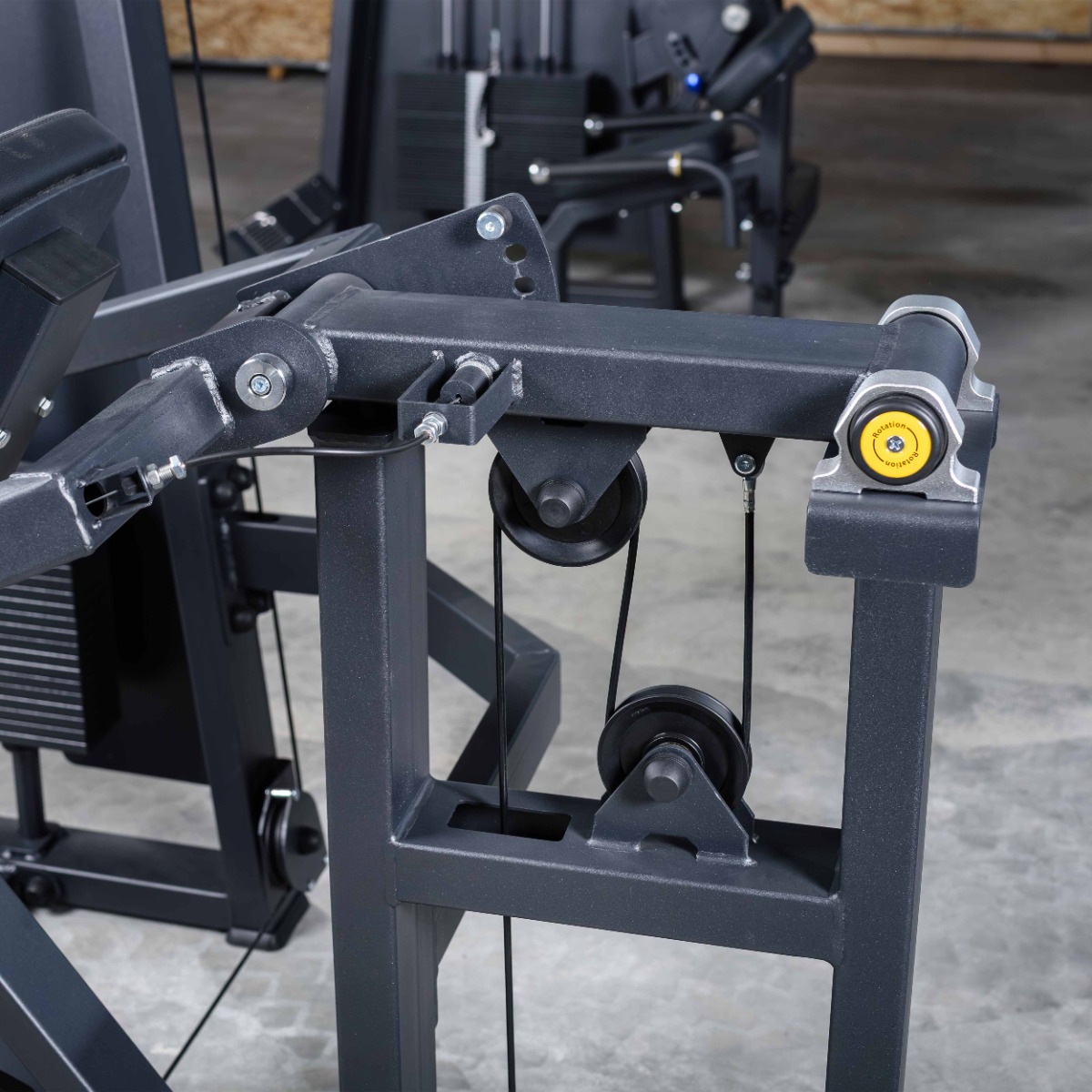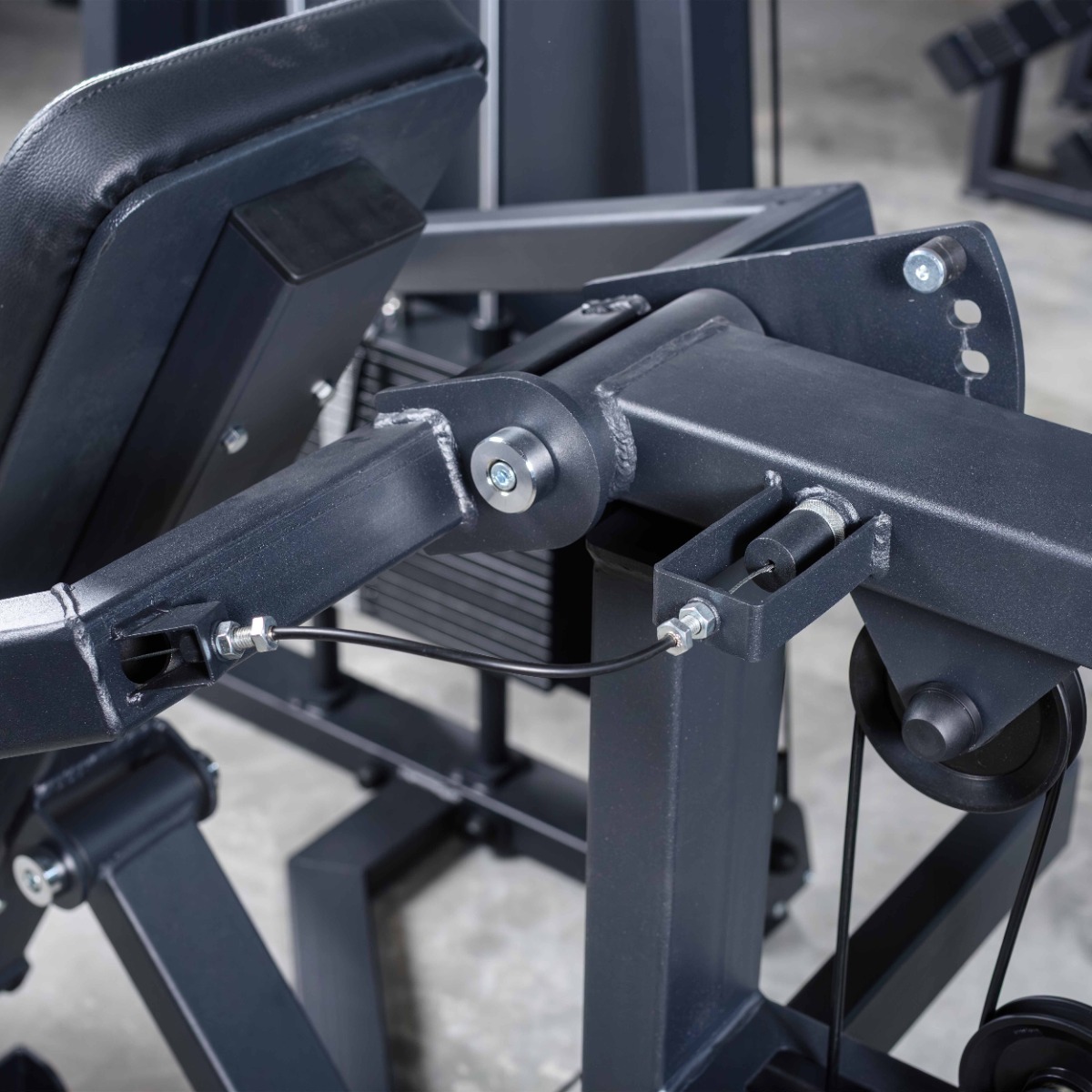 Система нагрузки – тросовая, с весовым стеком 100 кг. Весовой стек выполнен из стальных плит с порошковым покрытием.
