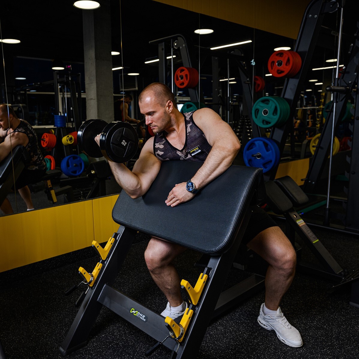 Скамья Скотта предназначена для выполнения упражнения, направленного на развитие бицепсов.