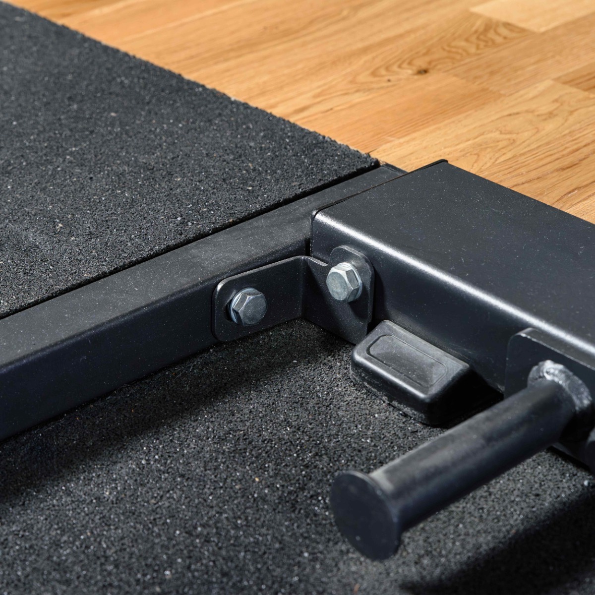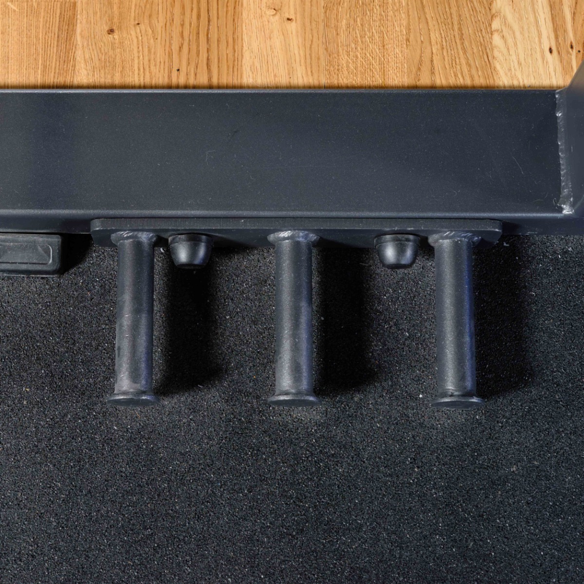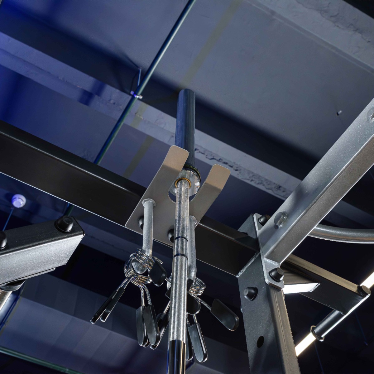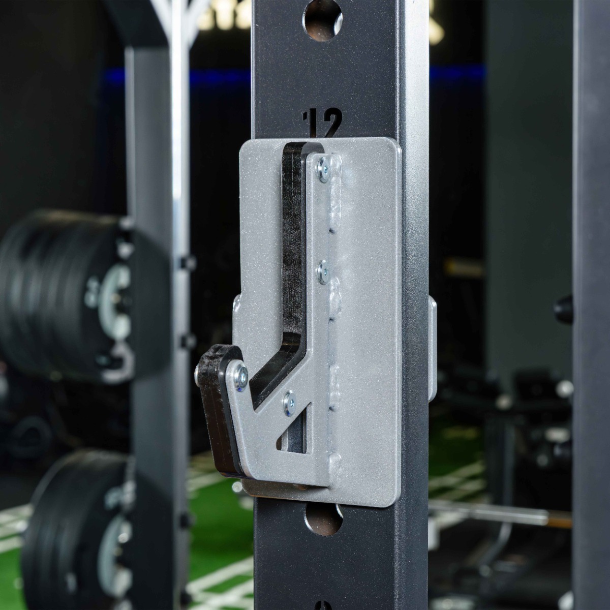 Страховочный упор имеет размеры ВШД 280х730х115 мм. Рама страховочного упора изготовлена из стального листового металла толщиной 8 и 5 мм и стальной профильной трубы 80х80х3 мм. Ось рамы страховочного упора изготовлена из стального круга диаметром 25 мм. Конструкция рамы упора обеспечивает надежную, быструю фиксацию упора на стойке, а винтовой фиксатор позволяет плотно прижать упор к стойке. Наличие на упоре накладки из монолитного поликарбоната оберегает гриф от повреждений. Все листовые детали и детали из трубы изготовлены на высокоточном лазерном оборудовании. В комплекте 2 упора (пара).