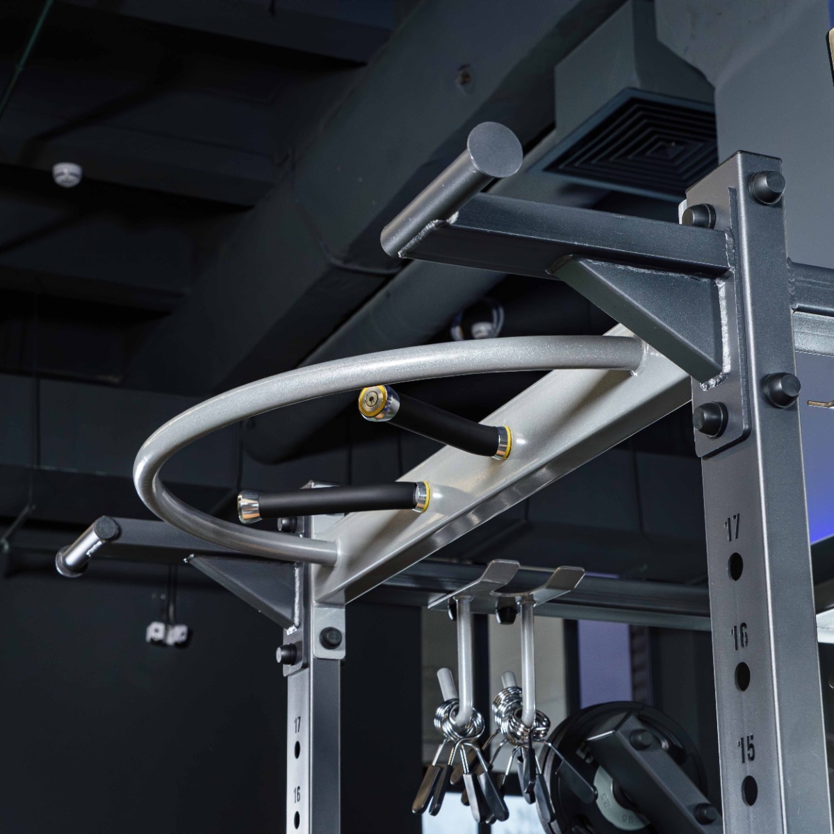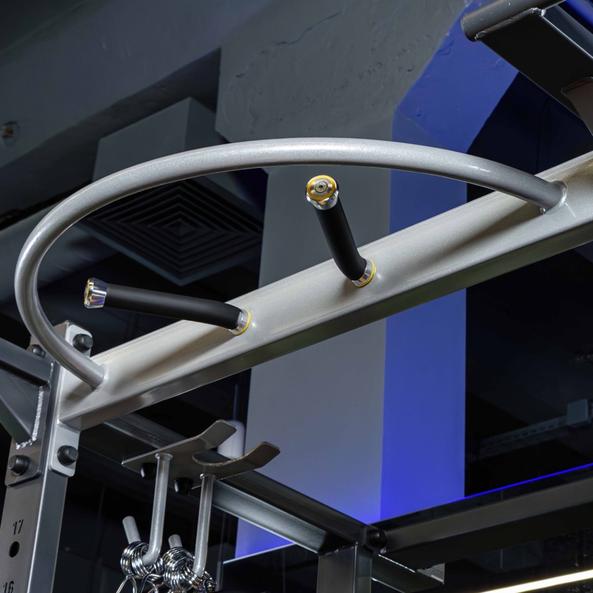 из положений сидя или лежа. Вверху силовой рамы имеются две удобные рукояти, выполняющие функцию турника.