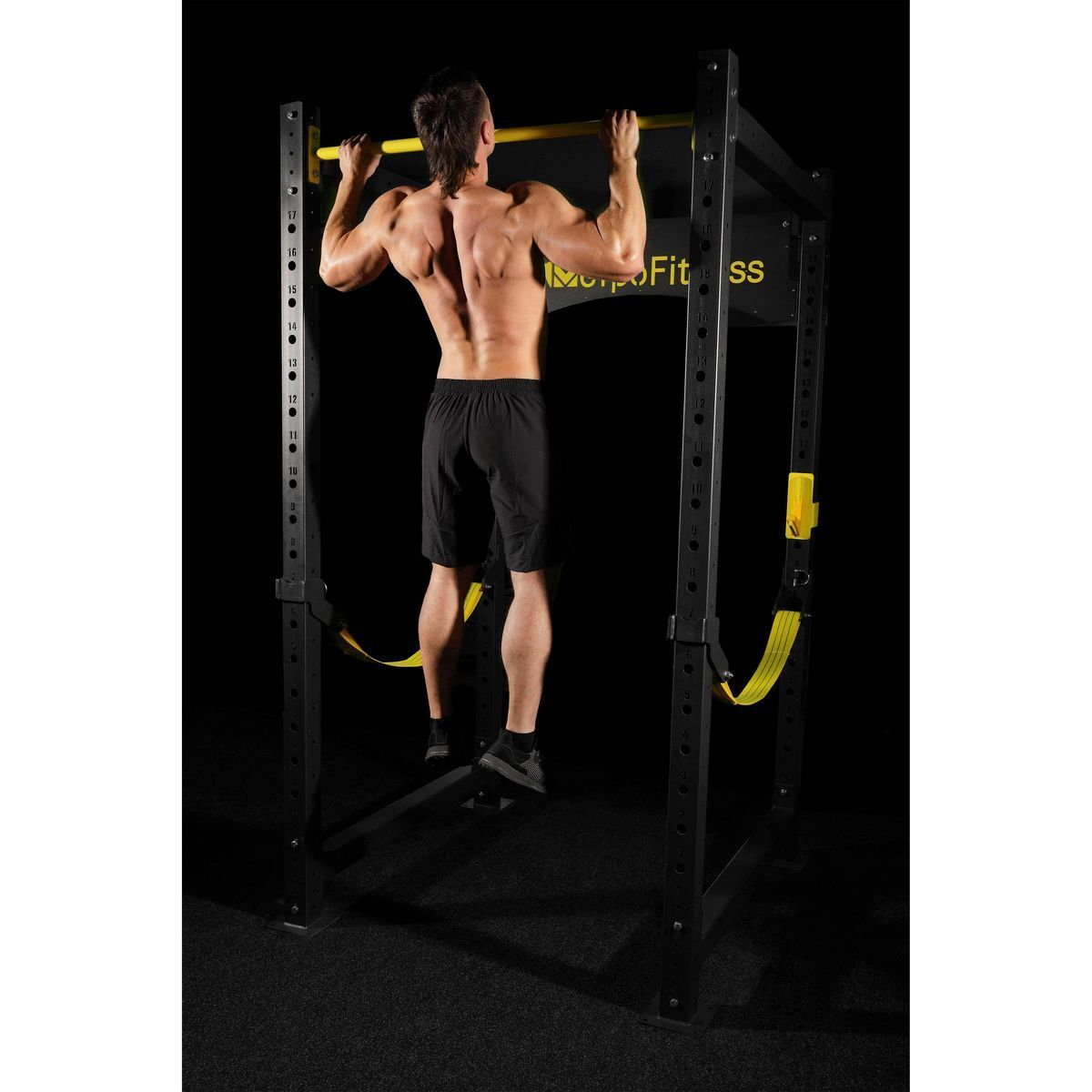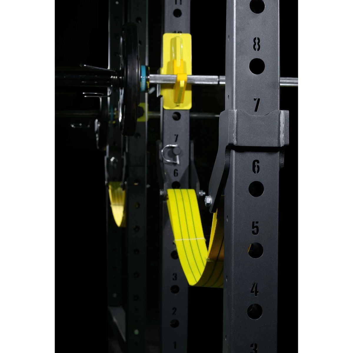 Силовая рама оснащена регулируемыми по высоте страховочными упорами и фиксаторами для штанги, которые можно подстраивать под рост спортсмена или под конкретные тренировки, так же это позволяет установить скамью для выполнения упражнения жим из положений сидя или лежа. Вверху силовой рамы расположен турник. Страховочные упоры сделают упражнения со штангой более безопасными и менее травмоопасными для спортсменов.