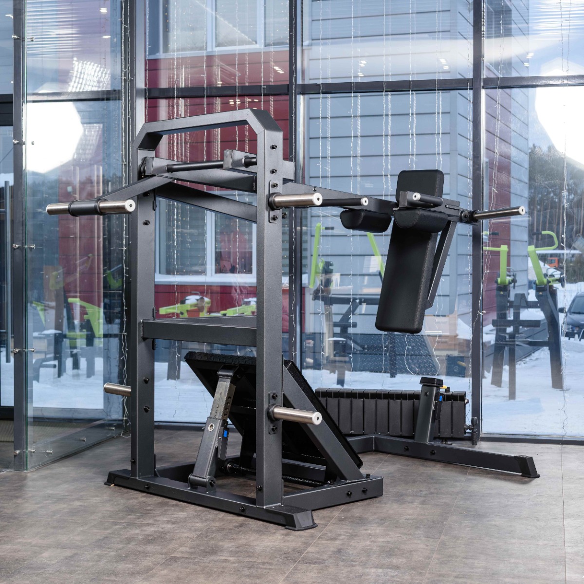 Профессиональный тренажёр для коммерческого использования A610 Маятниковые приседания предназначен для базовой тренировки квадрицепсов, ягодичных мышц и задней поверхности бедра. Маятниковый механизм обеспечивает глубокую амплитуду движения и контролируемую нагрузку, а высокая спинка и подушки под плечи создают устойчивую и безопасную фиксацию корпуса.