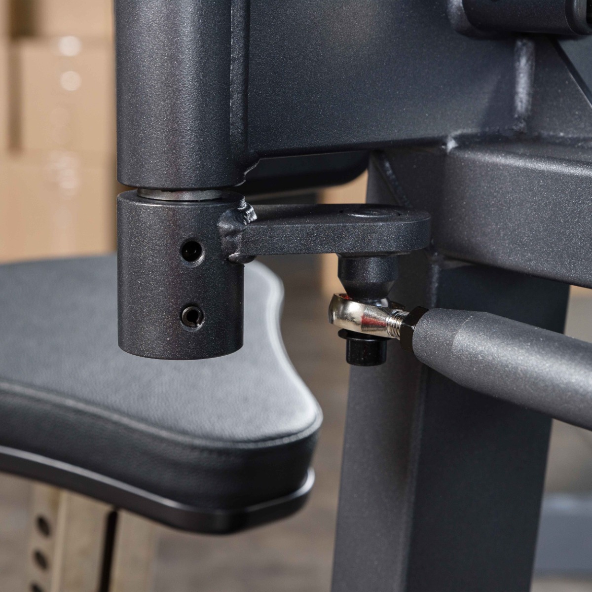 На каждом рычаге установлены две рукояти – вертикальная и горизонтальная. Вертикальные рукояти длиной 115 мм предназначены для акцентированной проработки трапециевидных мышц, горизонтальные рукояти длиной 150 мм – для изолированной нагрузки на задние пучки дельтовидных. Диаметр рукоятей 30 мм, рабочие зоны покрыты мягкой ромбовидной накаткой. Торцы оборудованы металлическими заглушками, зафиксированными болтовым соединением.