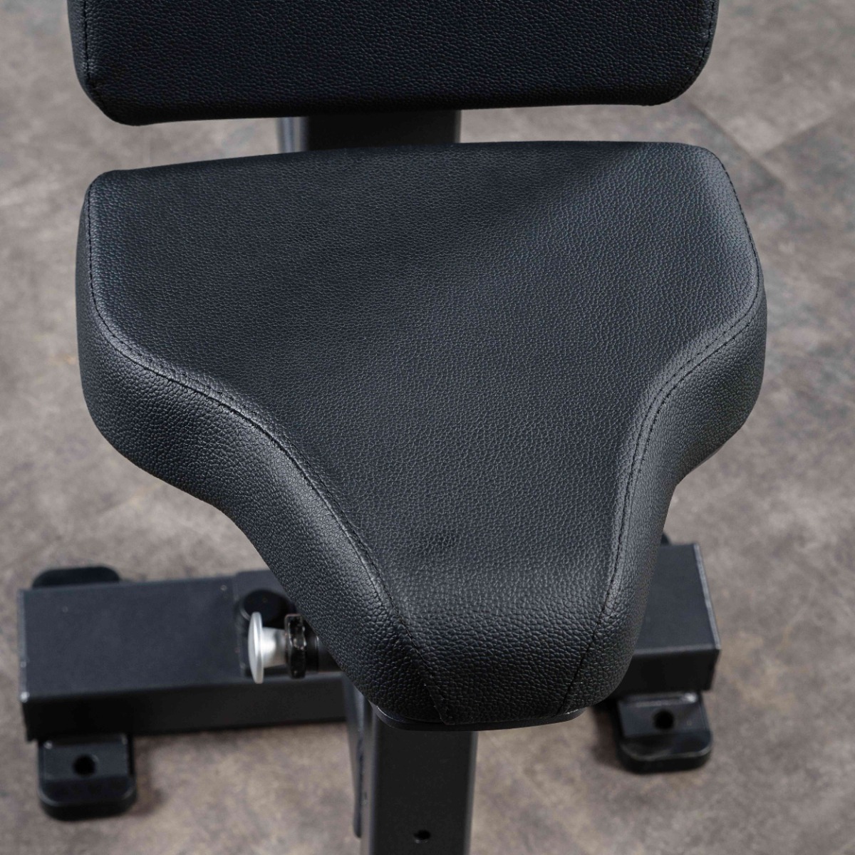 Сиденье анатомической формы с выемкой (ширина от 285 мм до 100 мм, длина 300 мм) регулируется по высоте в семи положениях с шагом 25 мм.