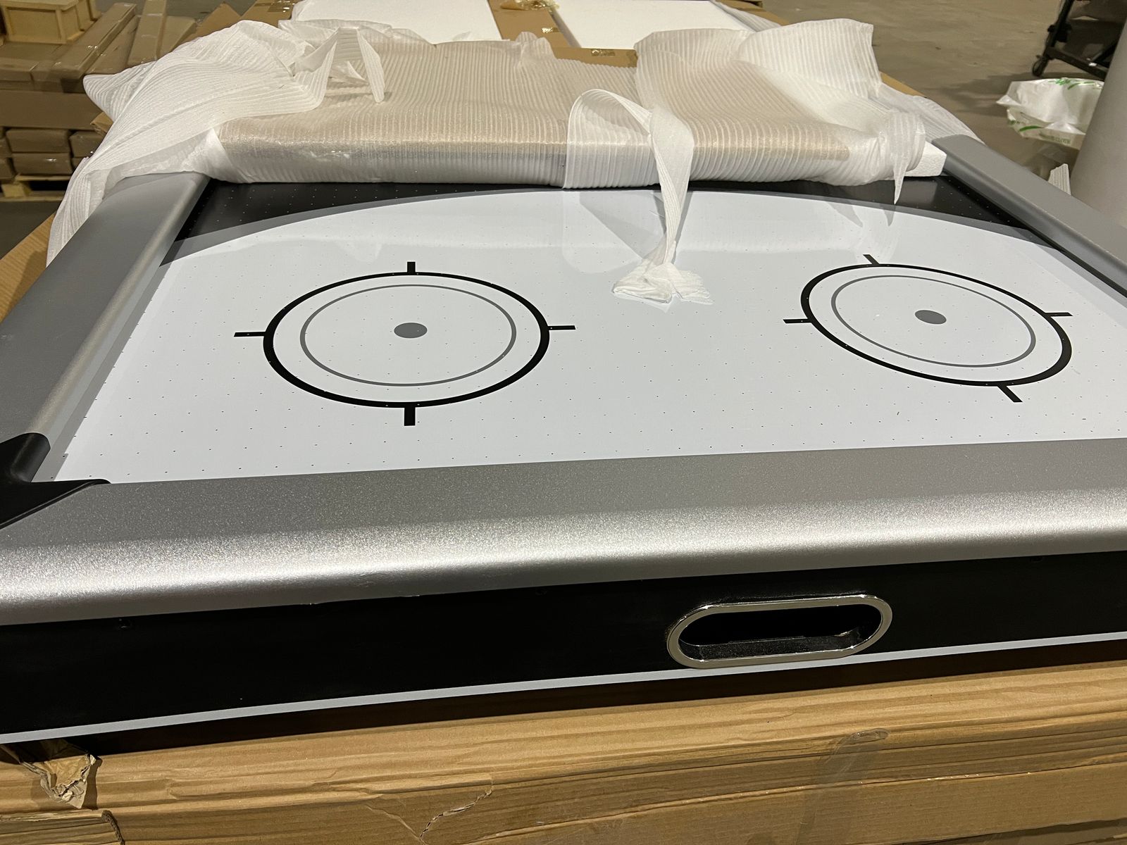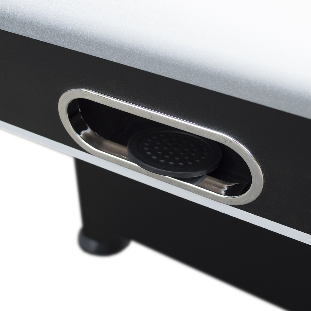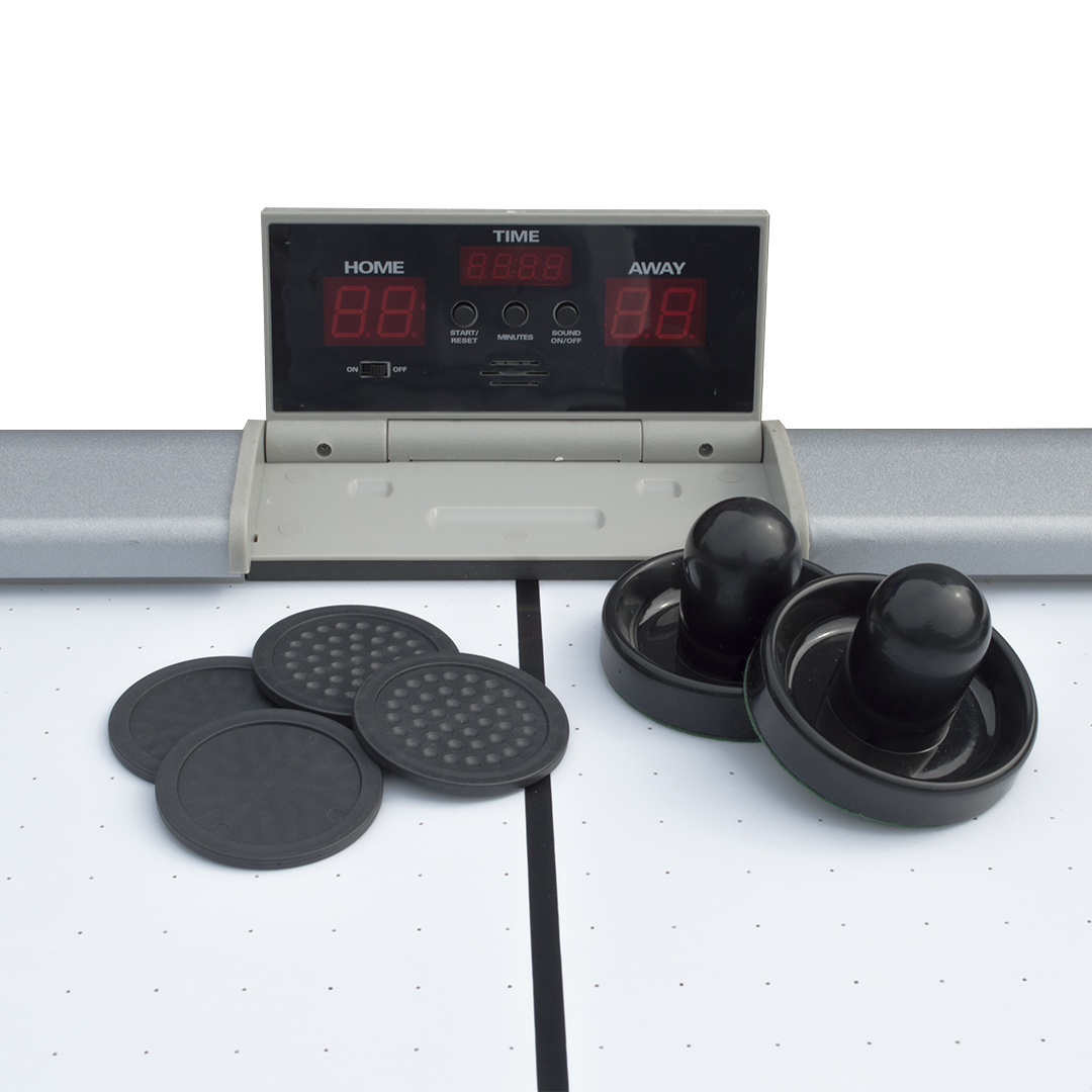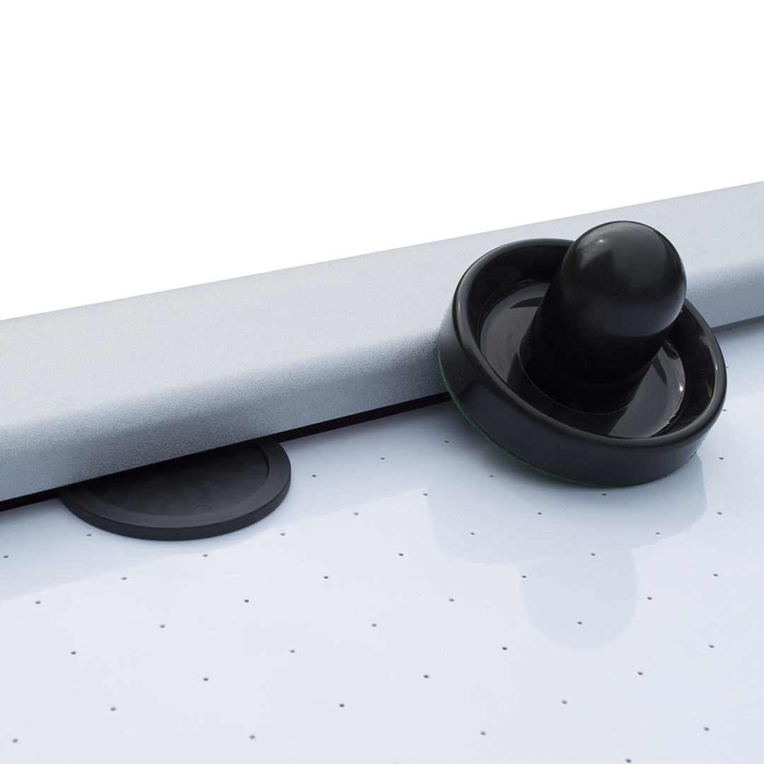 Аэрохоккей «ATOM» домашнего класса снабжен всем необходимым для игры и не требует приобретения дополнительных аксессуаров. У стола мощный компрессор, за счет чего шайбы скользят плавно и быстро. Четкие линии и строгие тона не отвлекают от игры и позволяют сконцентрироваться на ней целиком и полностью.