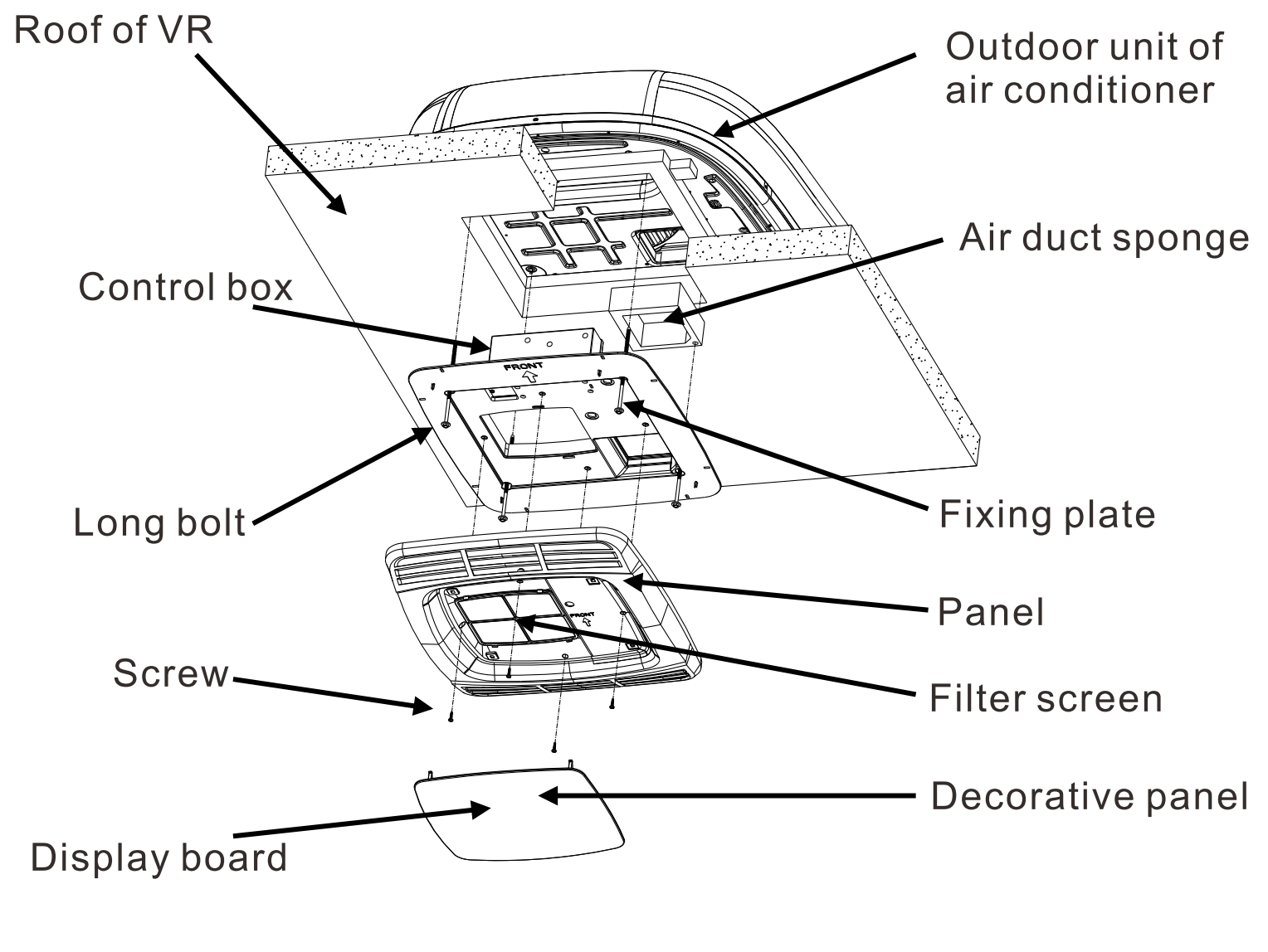 Полный установочный набор в комплекте: вентпанель(крепёжная рамка и облицовочная панель), ИК пульт ДУ, прокладки уплотнительные для воздухопотока наборные по толщине крыши.