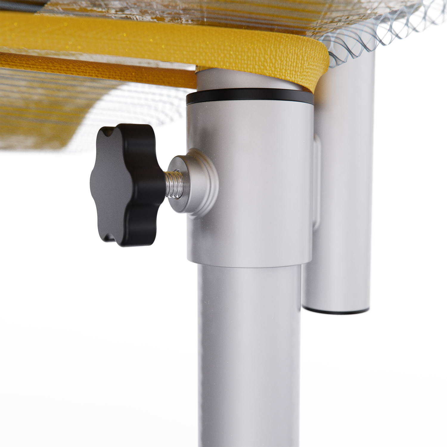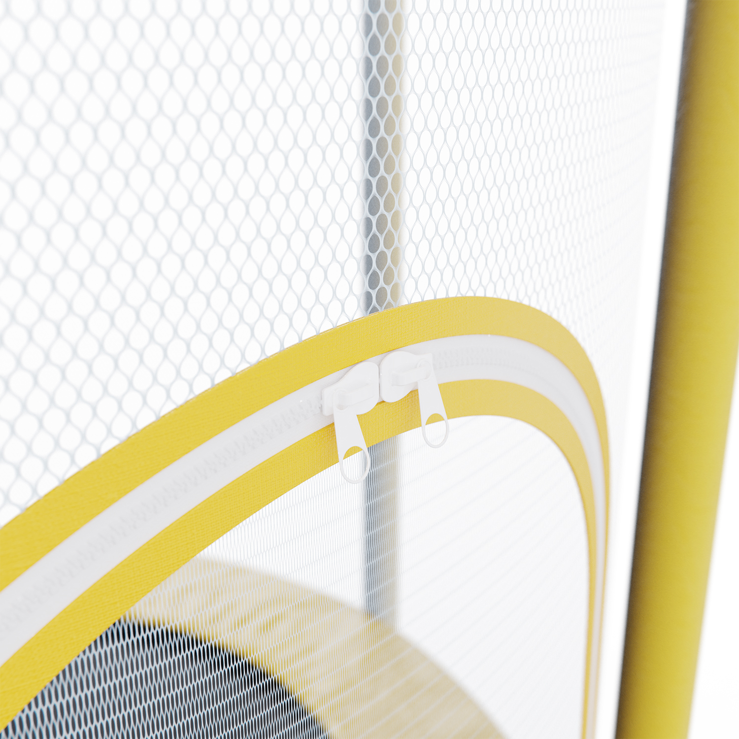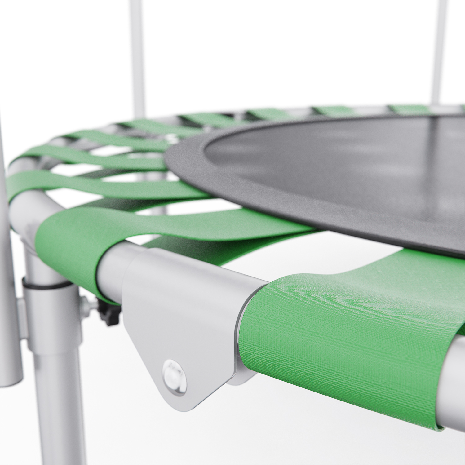 Рама и ножки выполнены из надёжной стальной трубы Ø25 мм с толщиной стенки 1,4 мм. Батут оснащён 6 ножками, которые равномерно распределяют нагрузку и обеспечивают устойчивость при прыжках. Мягкий защитный мат из ПВХ закрывает пружины и раму, предотвращая случайные удары и повышая комфорт во время занятий.