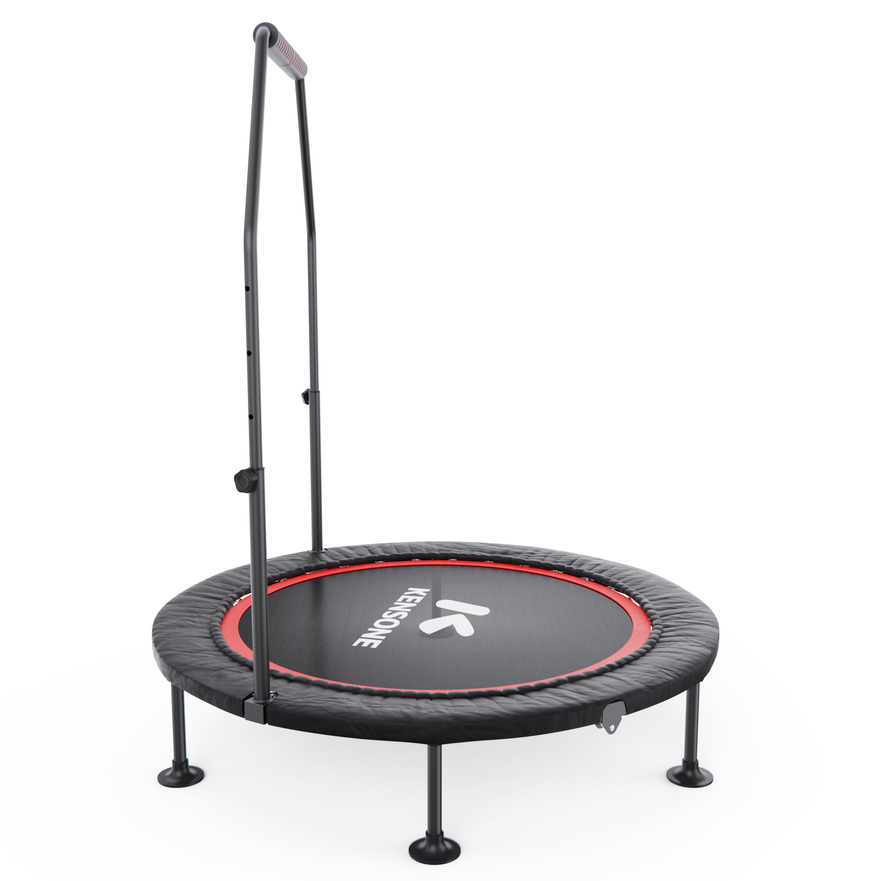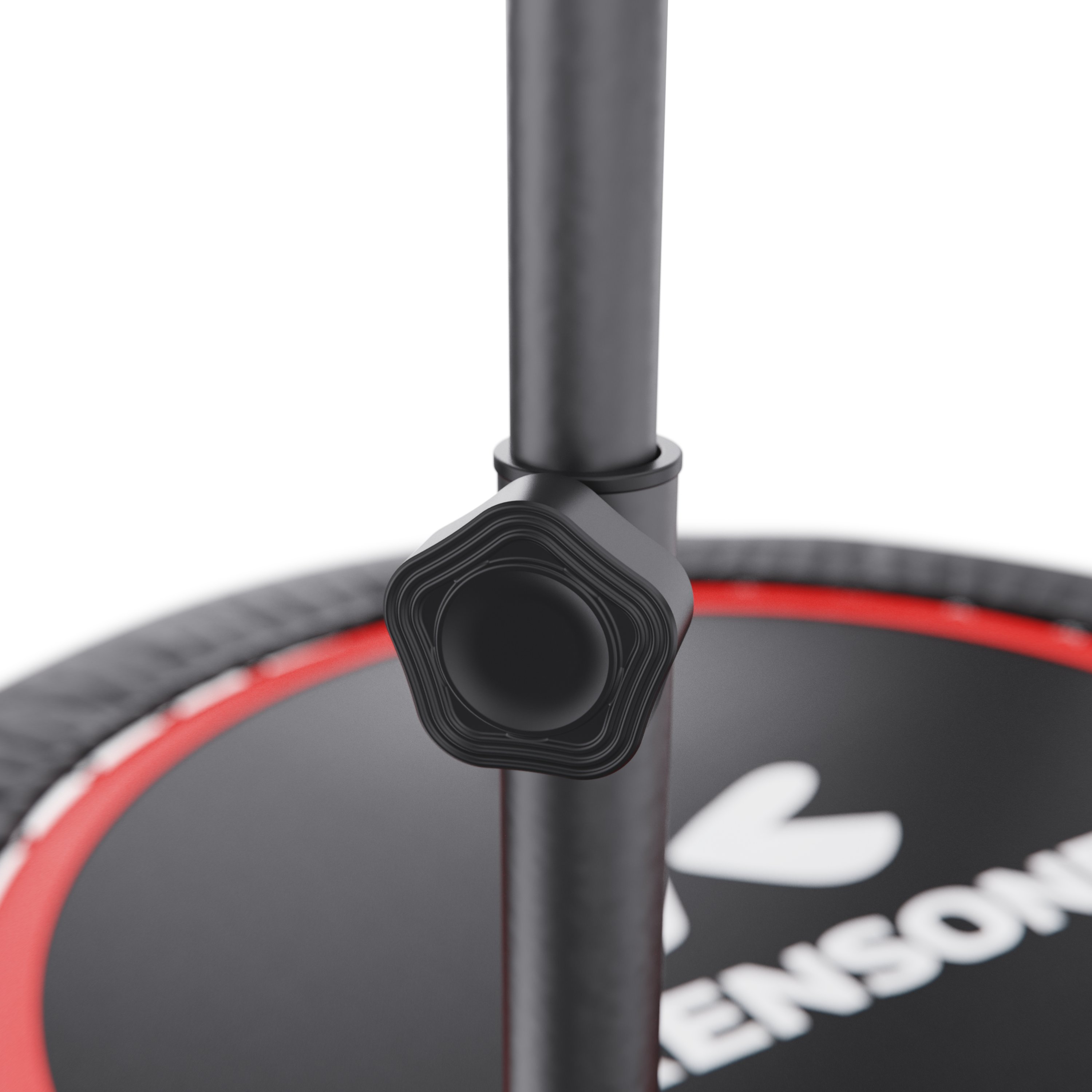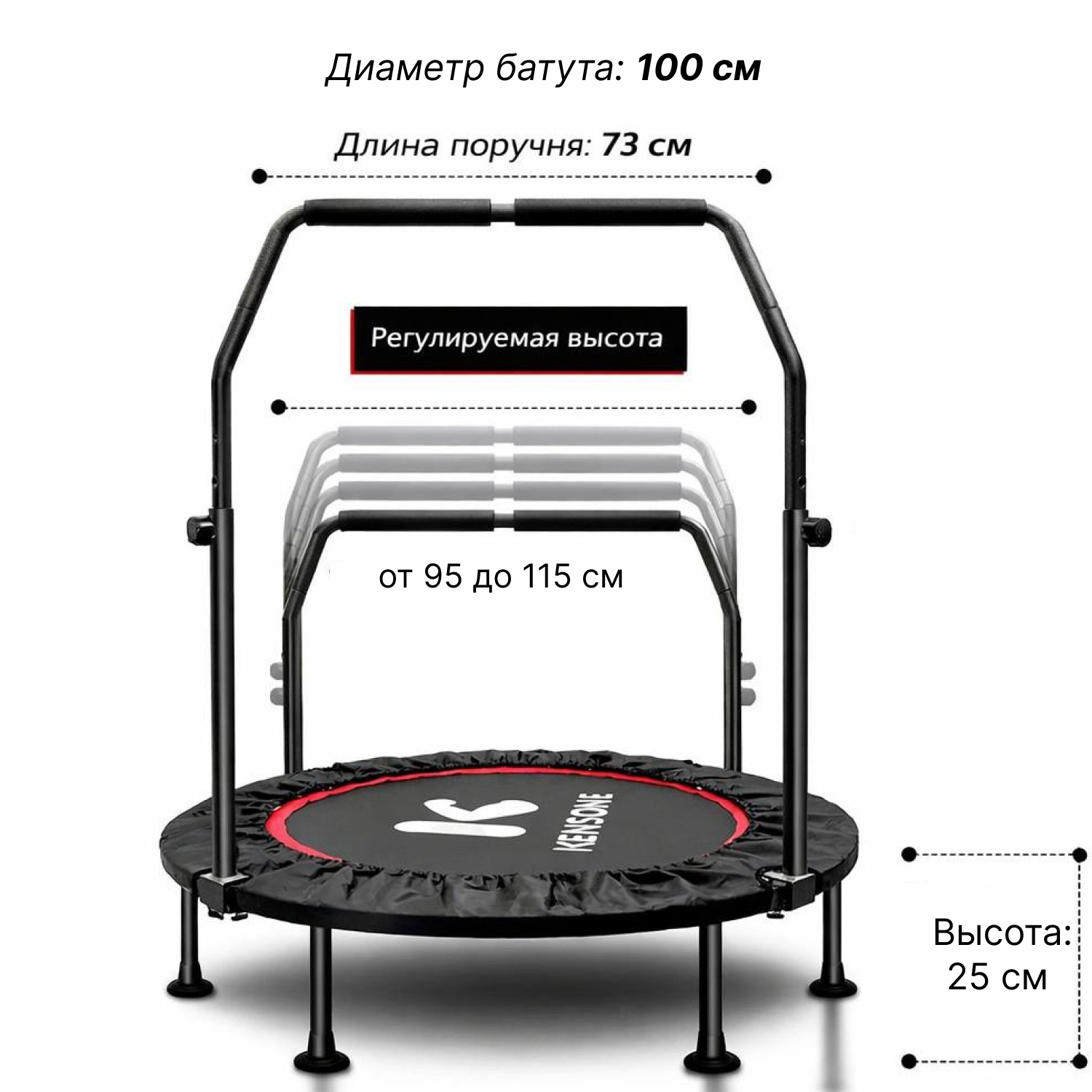 Батут оснащен регулируемым поручнем, который обеспечивает дополнительную поддержку и безопасность во время тренировок. Поручень регулируется по высоте на 5 уровней и может устанавливаться в диапазоне от 95 до 115 см, что позволяет легко настроить батут под рост пользователя и тип тренировки.