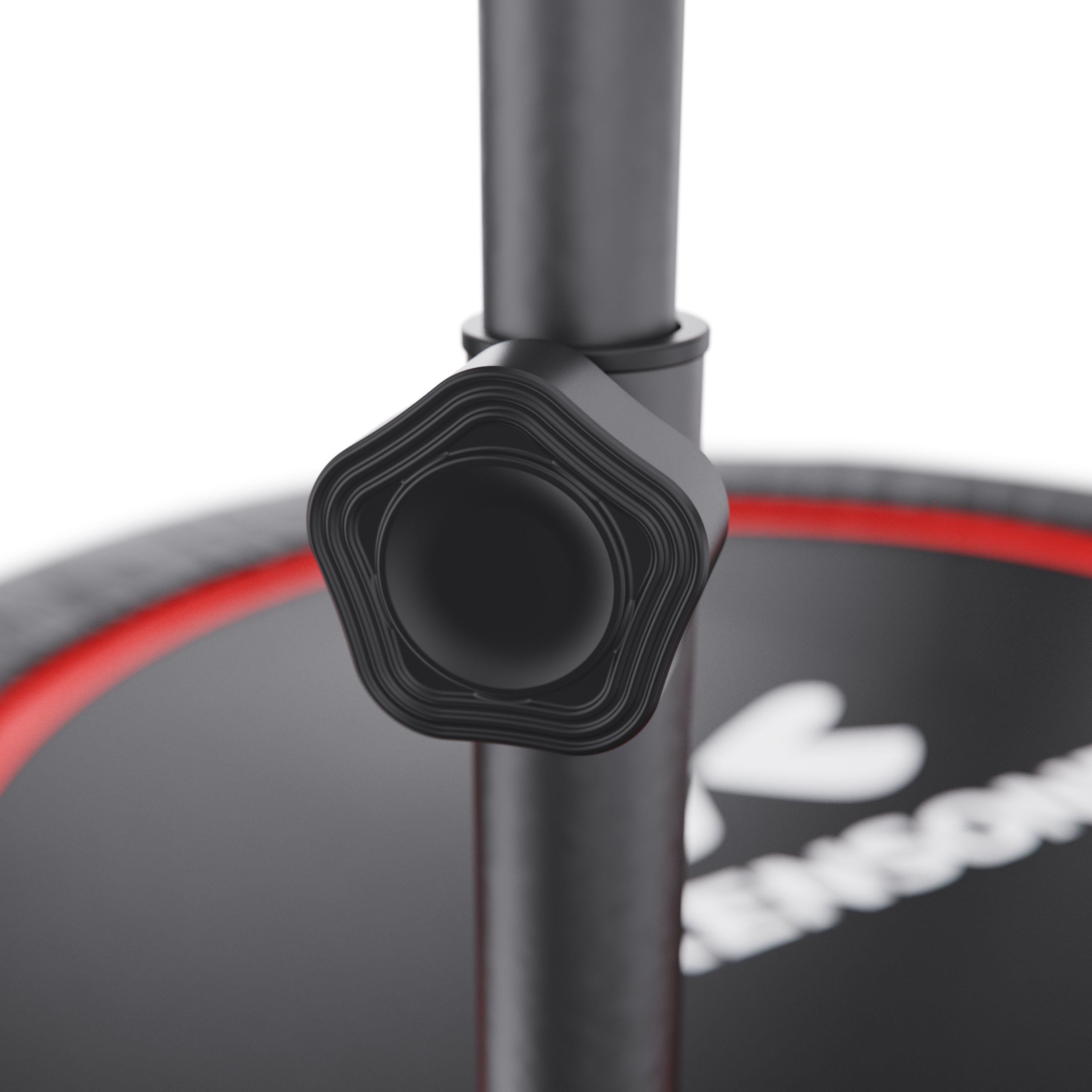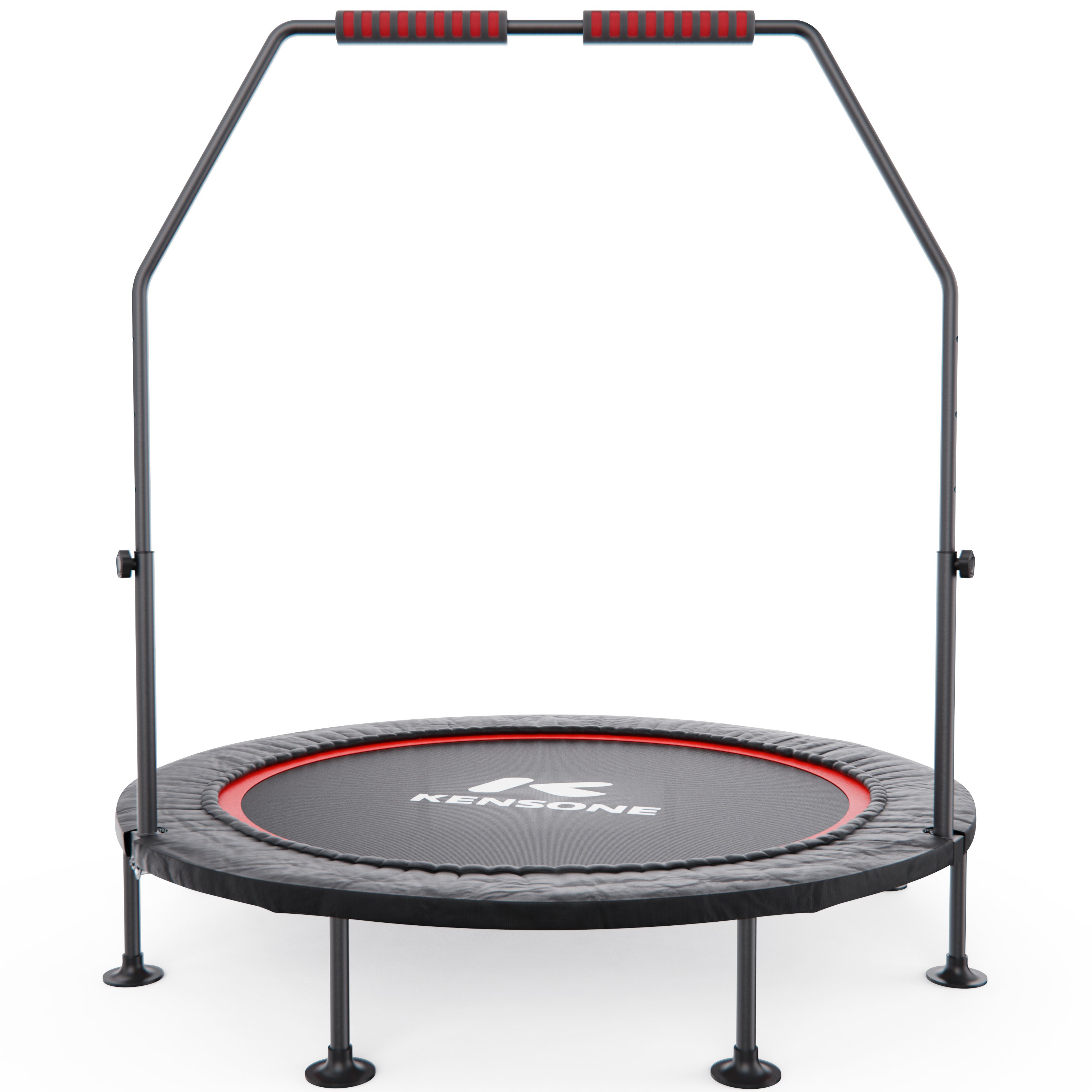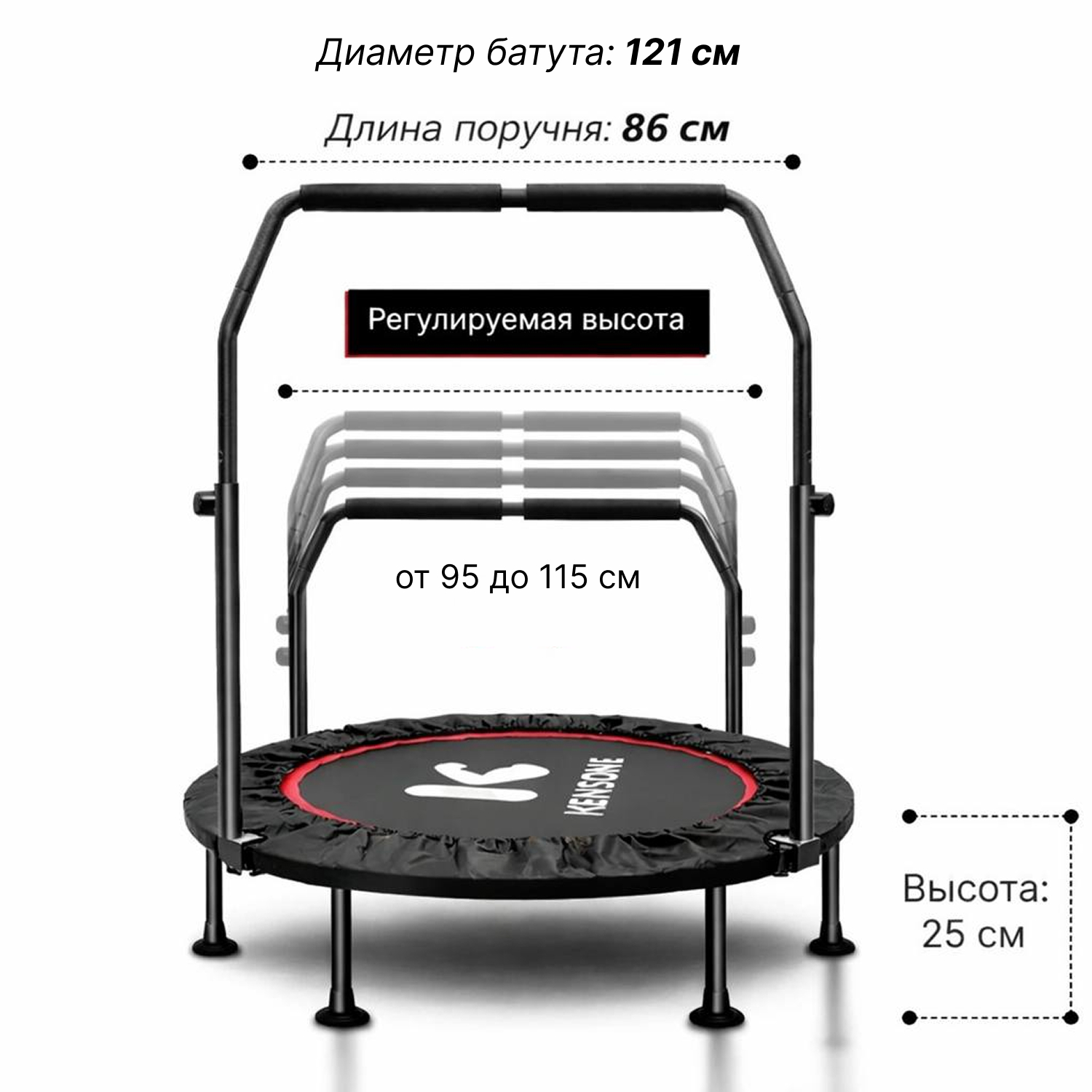 Батут оснащен регулируемым поручнем, который обеспечивает дополнительную поддержку и безопасность во время тренировок. Поручень регулируется по высоте на 5 уровней и может устанавливаться в диапазоне от 95 до 115 см, что позволяет легко настроить батут под рост пользователя и тип тренировки.