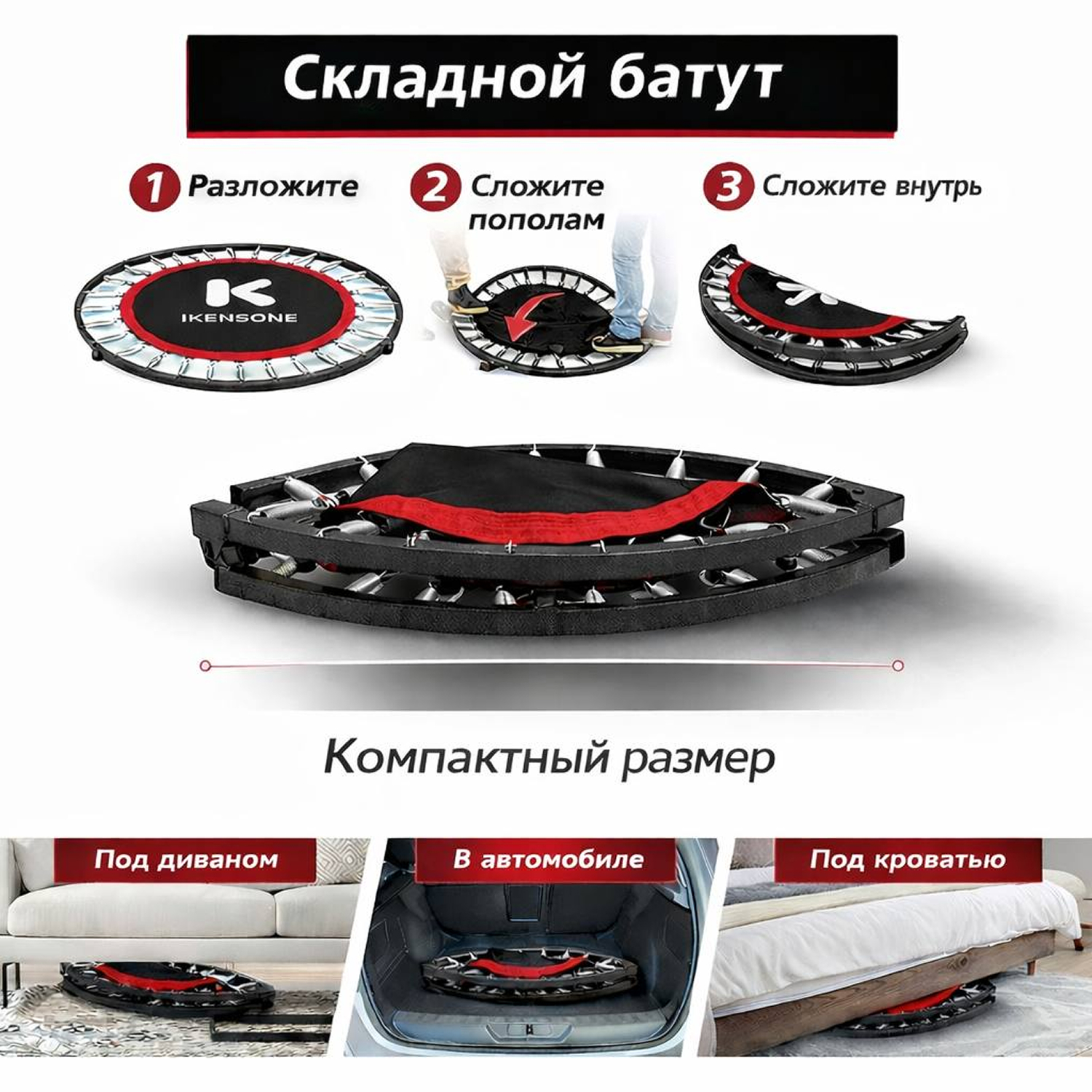 Высота батута составляет 25 см, что делает использование удобным и безопасным. Компактная конструкция подходит для домашних тренировок, а практичный черный цвет делает модель универсальной для любого интерьера.