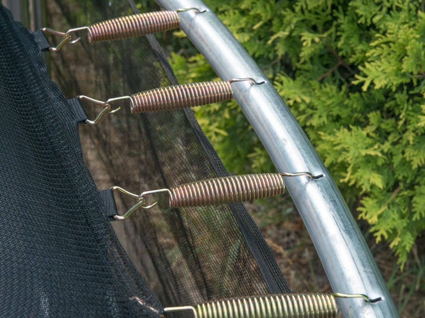 • 80 пружин обеспечивают надежное крепление полотна к раме и равномерное распределение нагрузки. Максимальный суммарный вес пользователей — 240 кг, что является лучшим показателем  на рынке для батутов данного класса.
