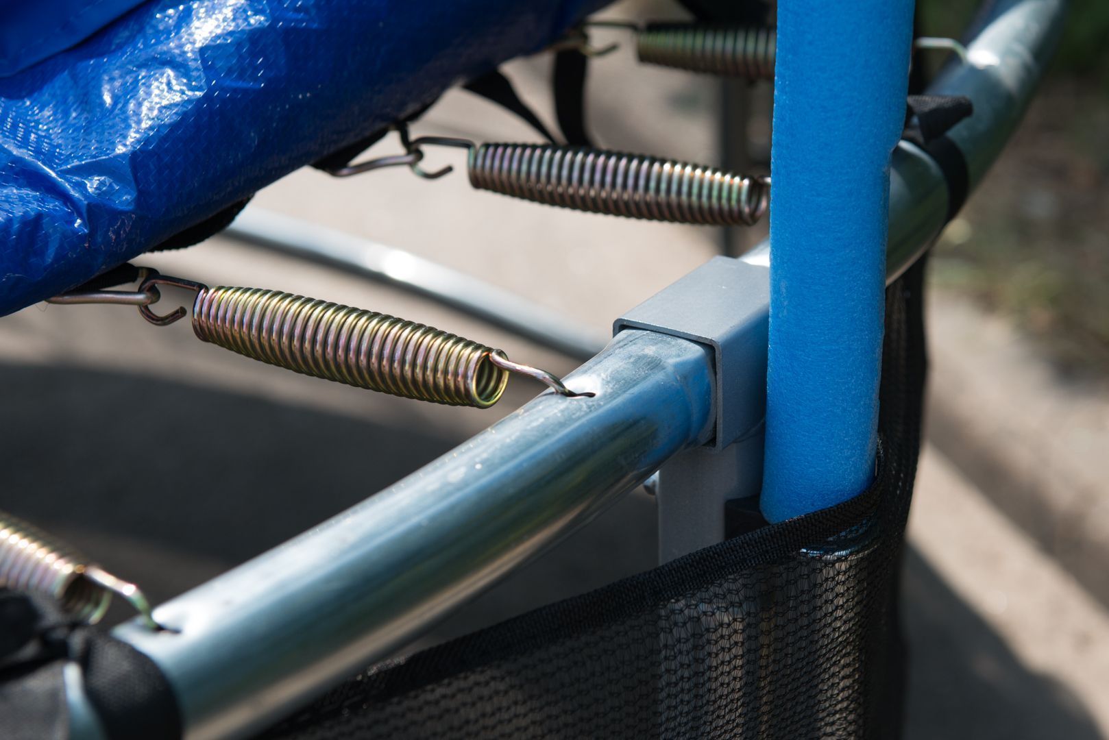 Рама батута изготовлена из оцинкованной стальной трубы Ø38 мм. Специальные кронштейны "T-Connector" квадратного сечения исключают случайный поворот или ослабление соединения со временем.