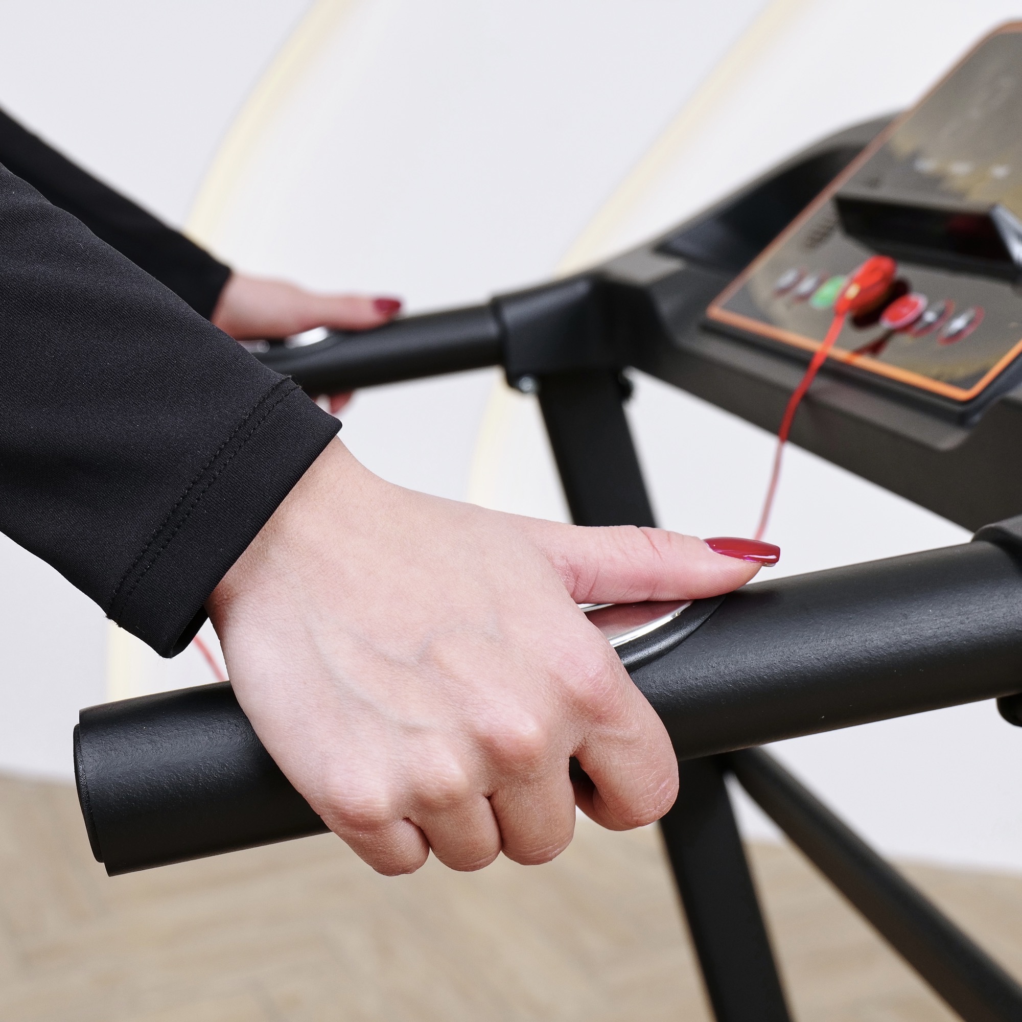 Для удобства пользователей предусмотрены держатель для бутылки, два кармана для мелочей и подставка под планшет. Сенсорные датчики на поручнях позволяют измерять пульс, а монохромный LCD-дисплей отображает все необходимые показатели: скорость, время, дистанция, калории и программы.