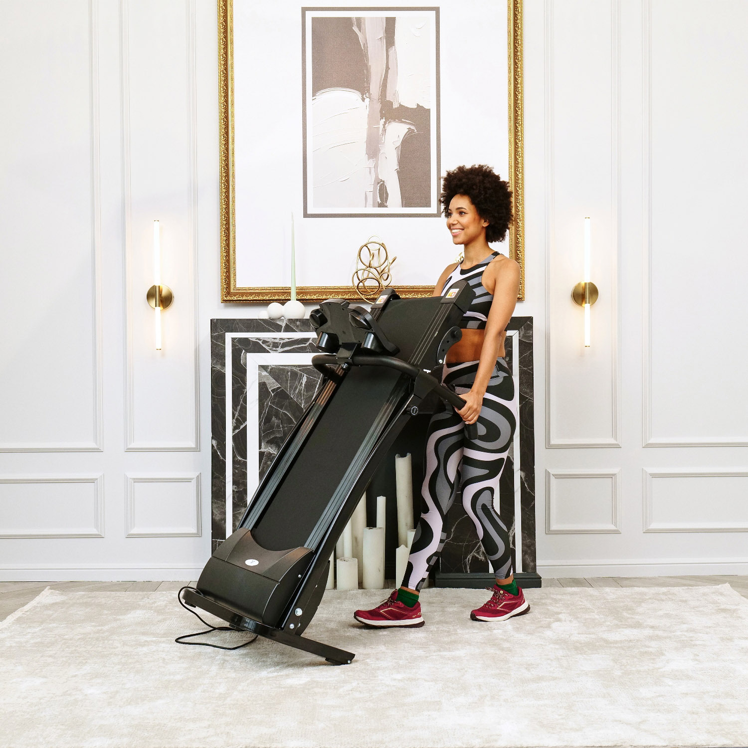12 встроенных программ и ручная регулировка угла наклона бегового полотна в 3-х положениях помогут разнообразить ваши тренировки. Складная конструкция с помощью встроенного амортизатора позволяет поднять полотно после тренировки и экономить пространство до следущего занятия.