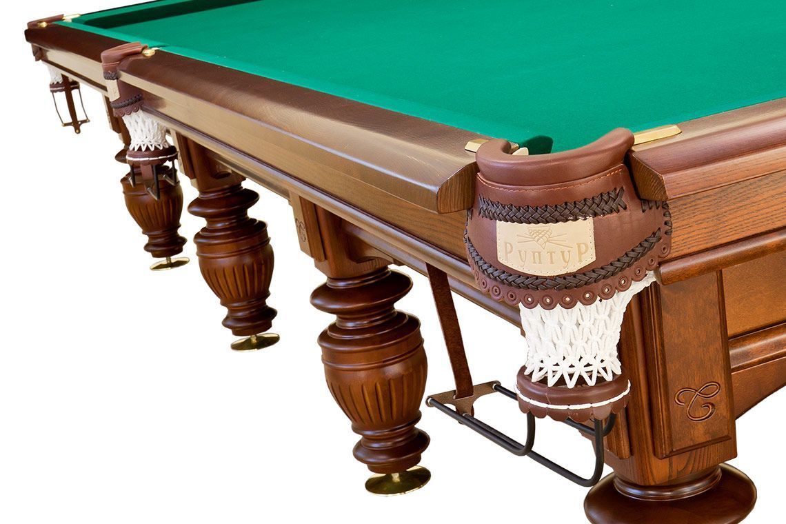 Отборный массив древесины — ставка на качество и долговечность изделия, а утонченный дизайн — демонстрация хорошего вкуса его обладателя. Сложная форма придает ногам видимую грацию. При этом высушенный по особой технологии массив дерева (ольхи, ясеня или дуба) с достоинством несет серьезный вес плит из натурального сланца. Профессиональные лузы органично вписываются в общую композицию за счет кожаных пелерин с декоративной шнуровкой, тиснением и перфорацией.