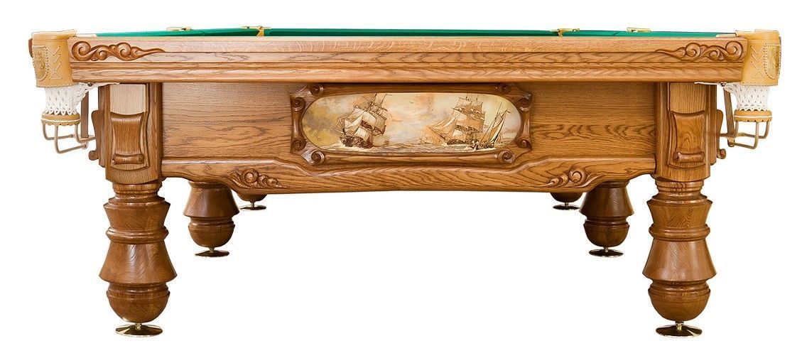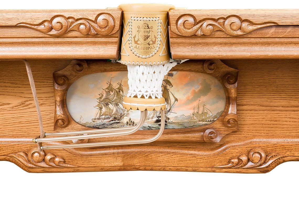 Коллекционный бильярдный стол «Адмирал» предназначен для ценителей морской тематики. Дизайн стола создан в стиле старинных парусных судов, которые богато покрывались резьбой ручной работы. Инсталлированные в борта картины, отражающие сцены морских баталий, удачно сочетаются с искусными и практически не повторяющимися волнами резных узоров.