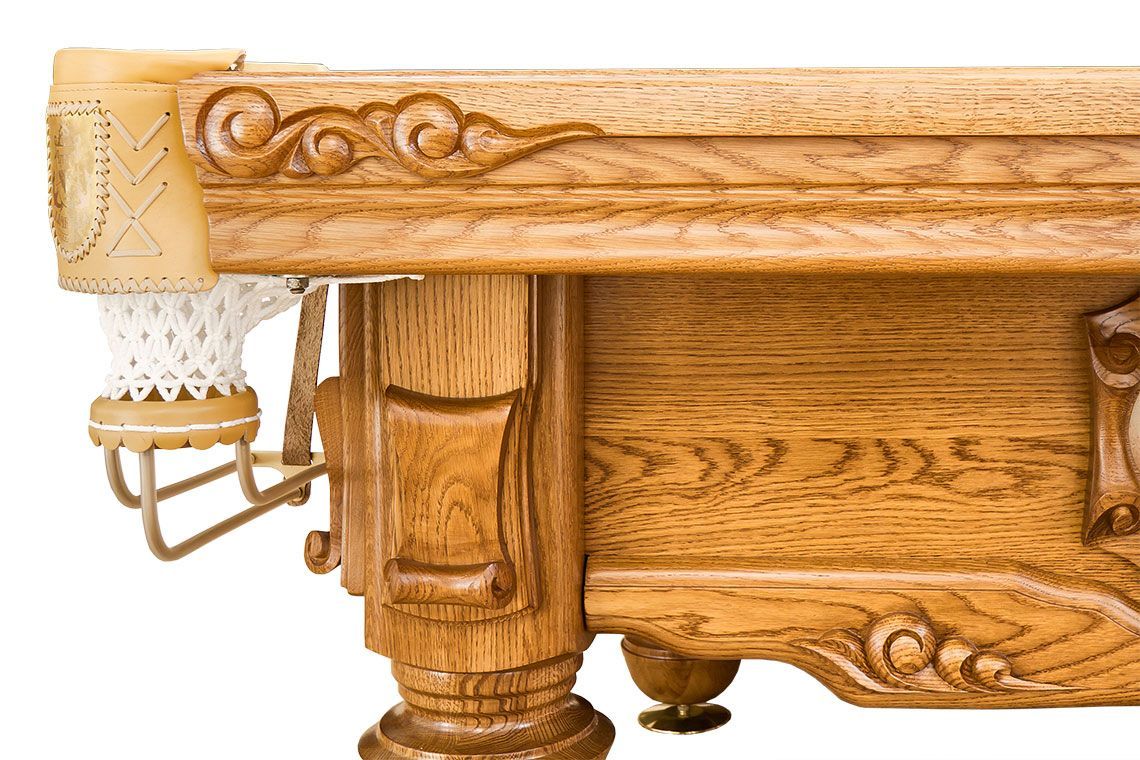Использование массива ясеня или дуба, богатый декор и кожаные лузы индивидуального изготовления со шнуровкой все это придаст уникальности коллекционному столу «Адмирал».