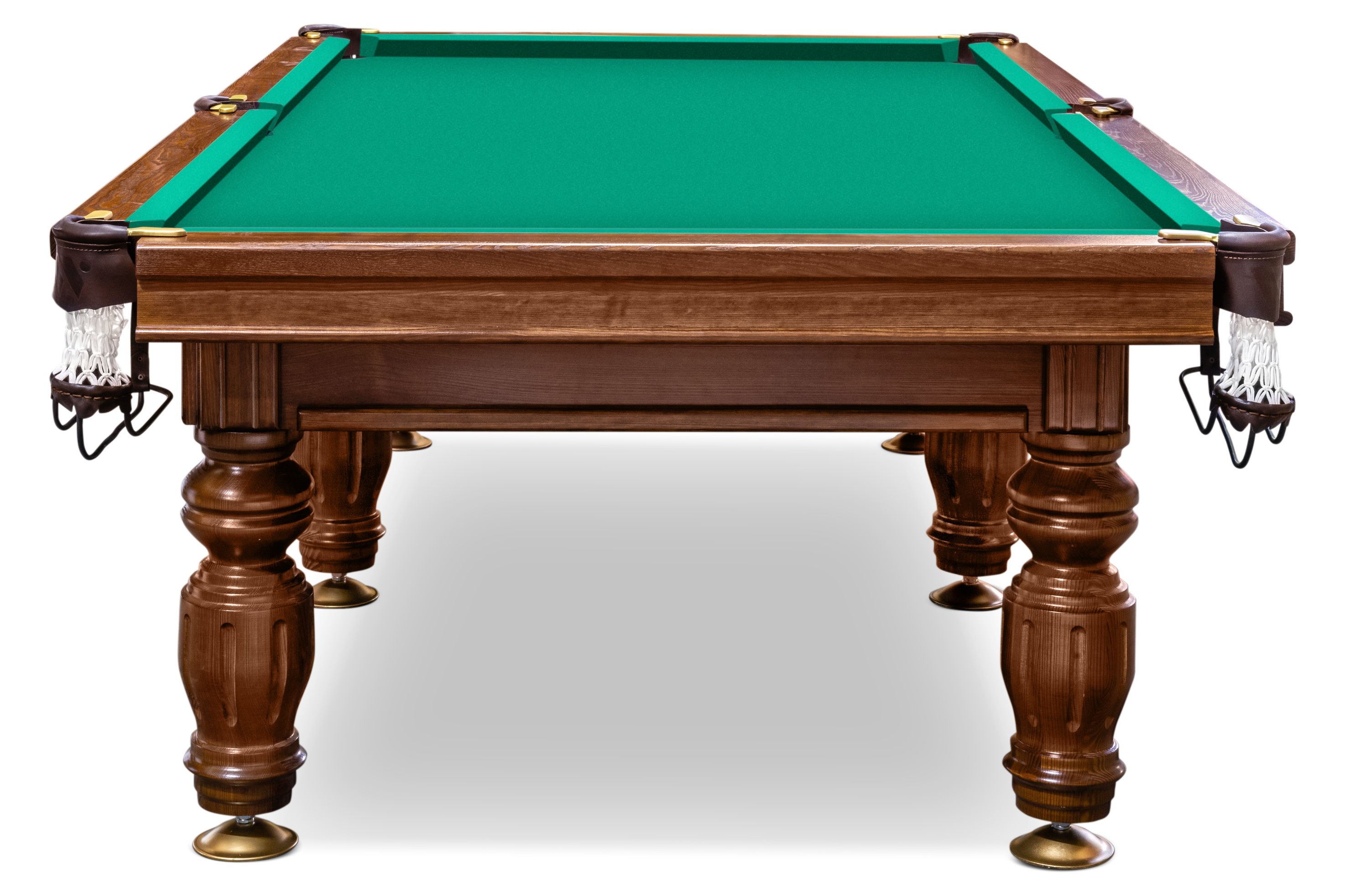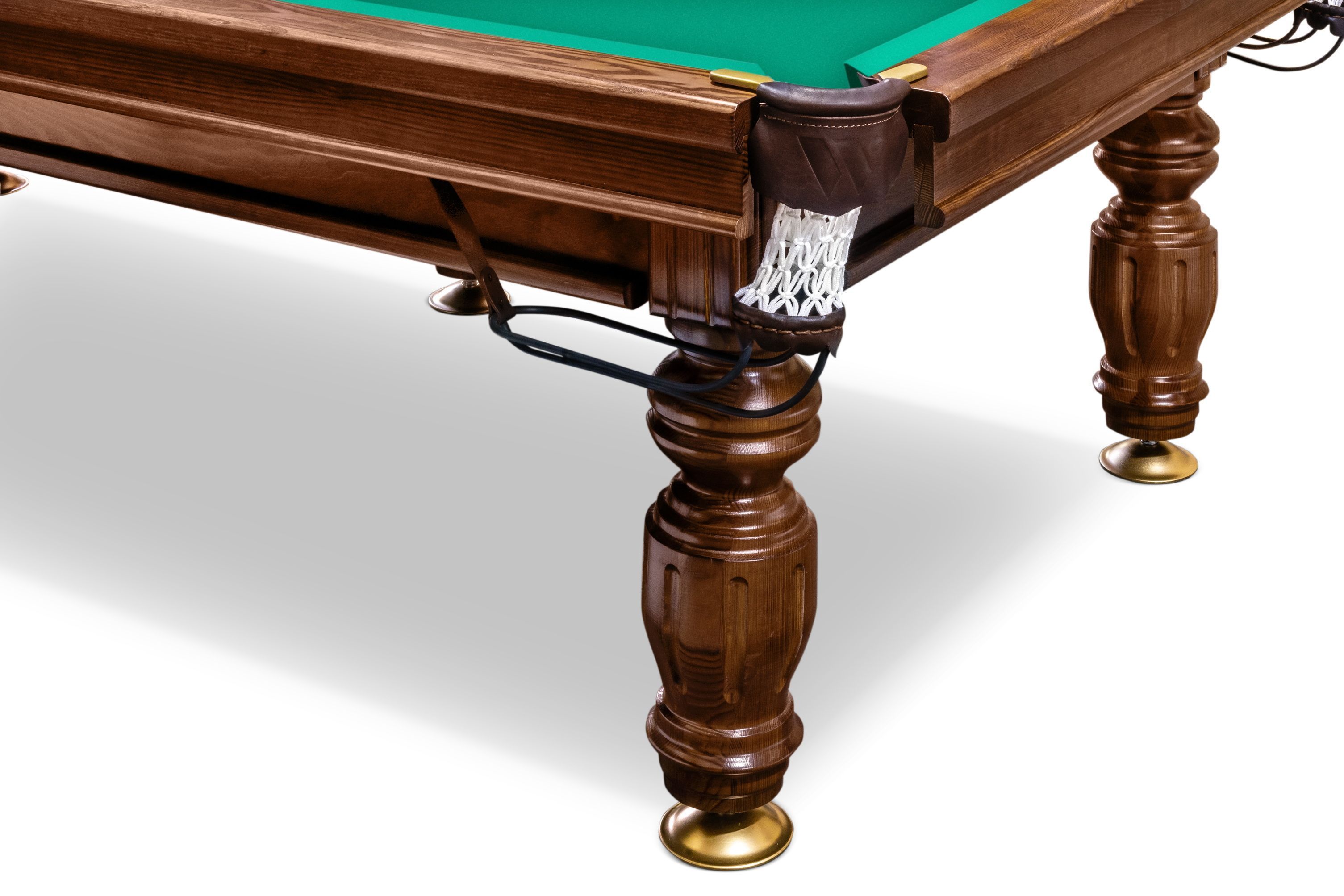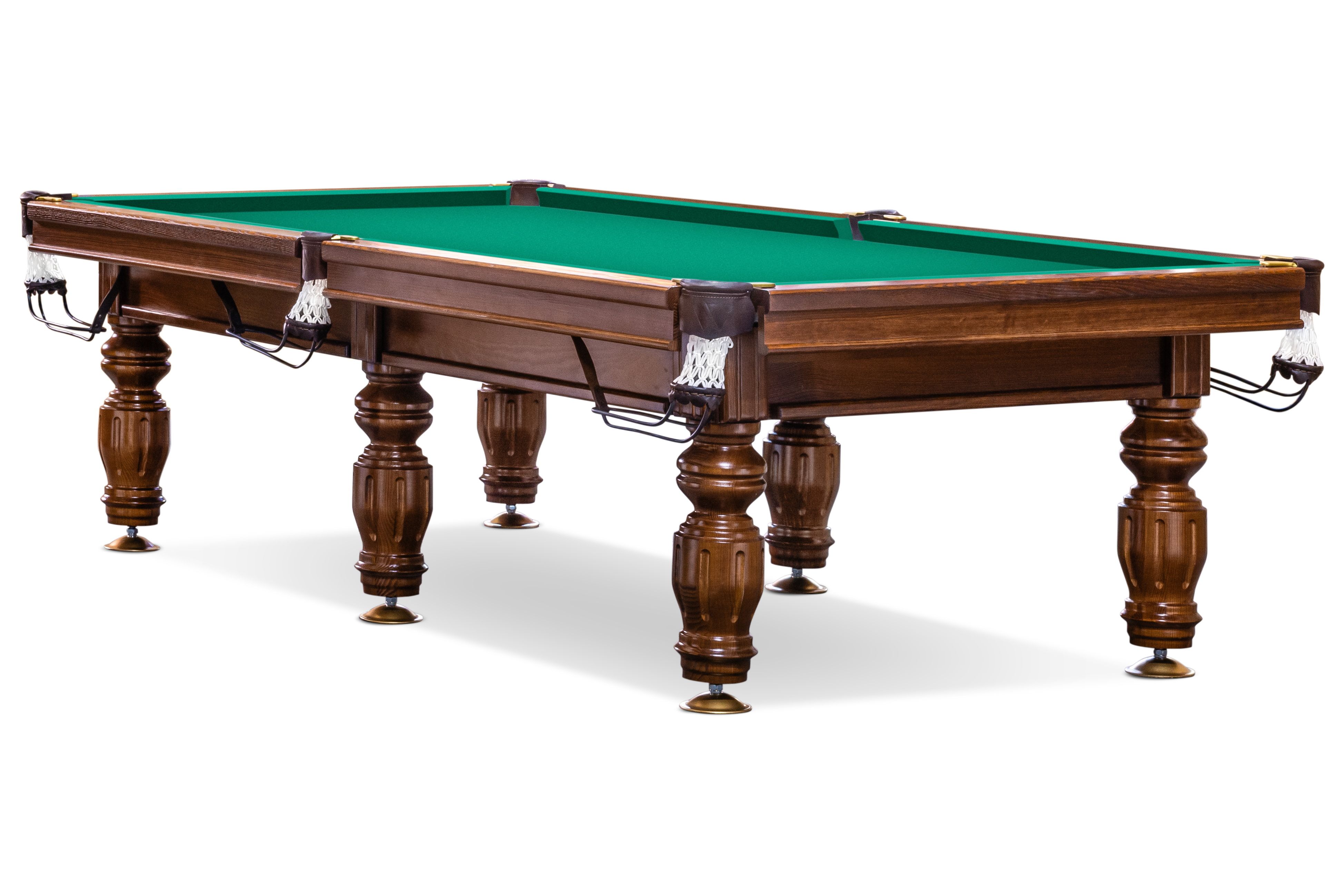 9-и футовый стол ПЕЧОРА на 6 опорах и с каменной плитой имеет отличные характеристики по всем параметрам. Плита задает столу идеальную геометрию, продуманная конструкция обеспечивает надёжность. Правильная бортовая резина, сукно и лузы, которые идут в комплекте гарантируют столу отличные игровые свойства. Борта, изготовленные из ясеня, в сочетании с лузами из льна и кожи придают столу дорогой благородный вид.