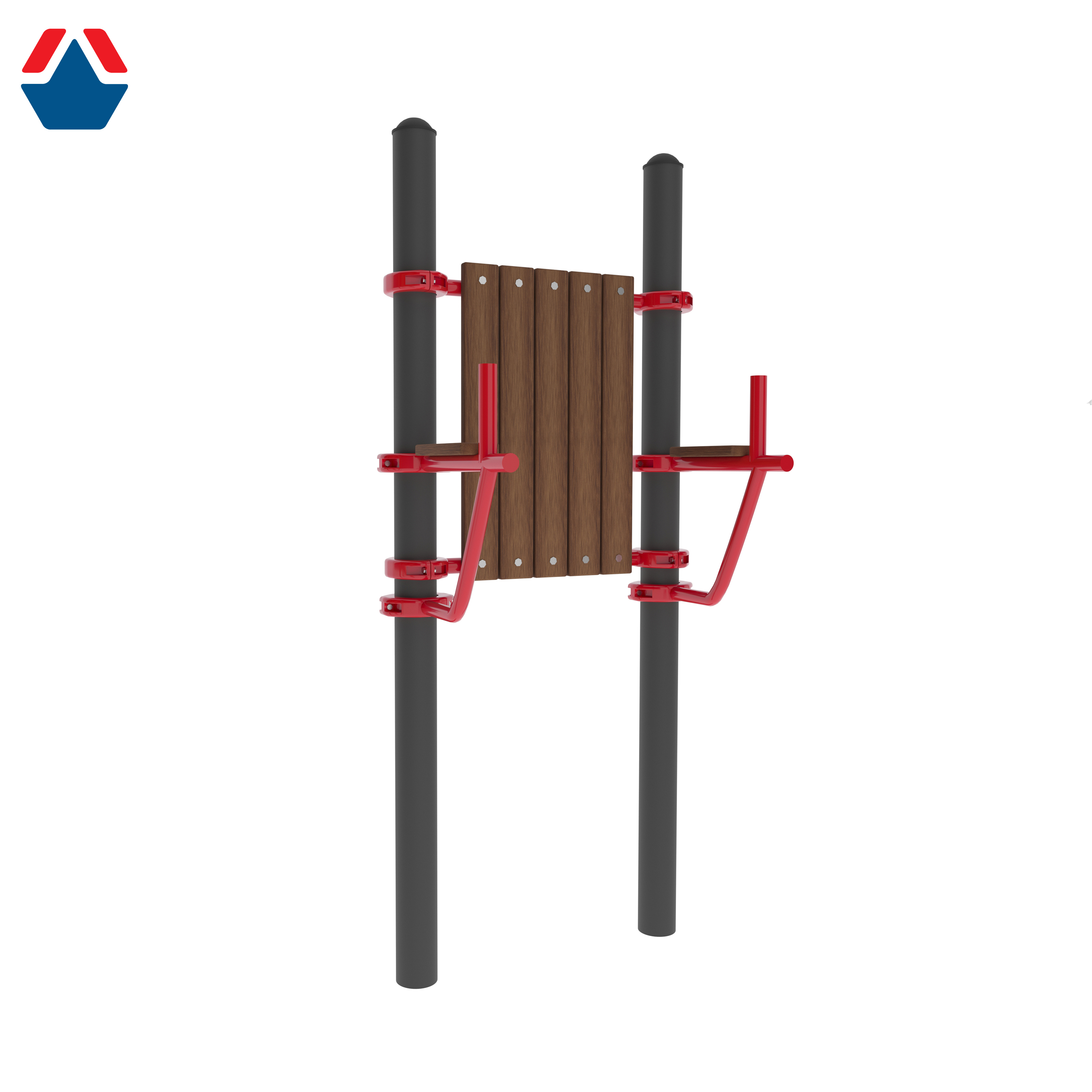 Описание: Спортивный комплекс состоит из двух вертикальных опорных столбов, перекладин и вертикальной стойки с упорами для рук и спины.