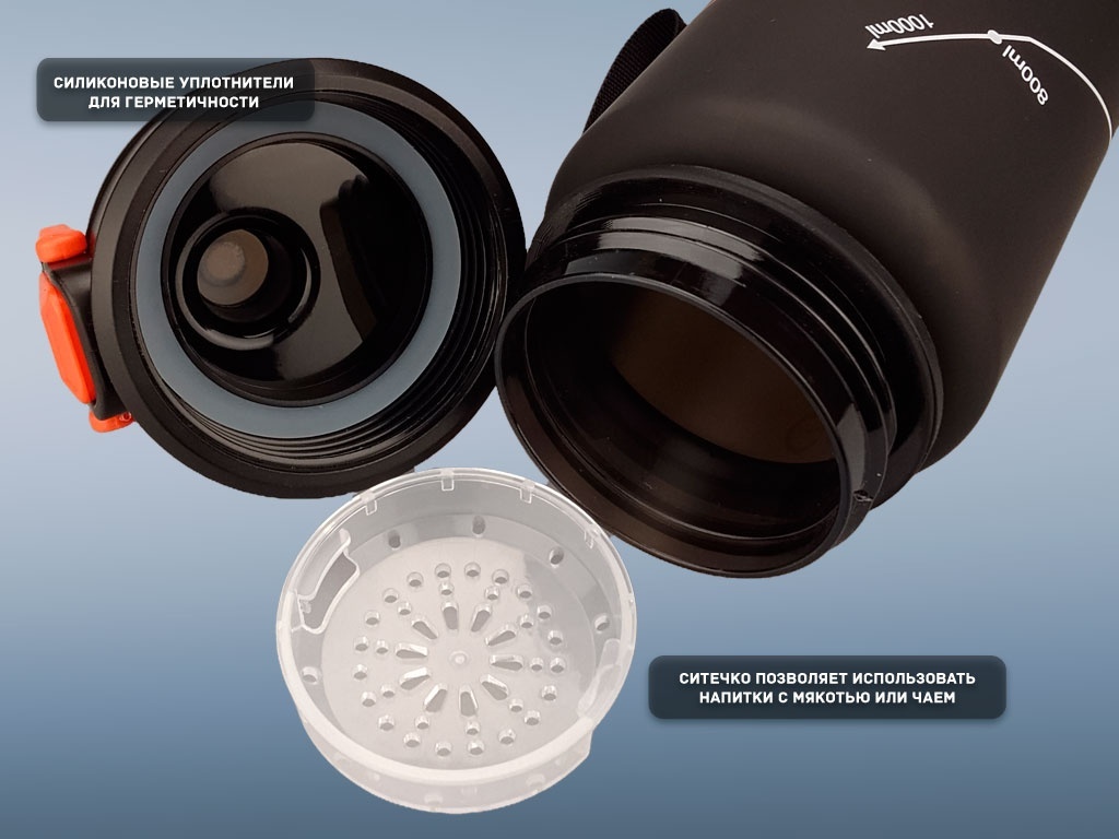 - Оптимальный объём — 1000 мл: достаточно жидкости на целый день, при этом бутылка остаётся компактной и удобной.