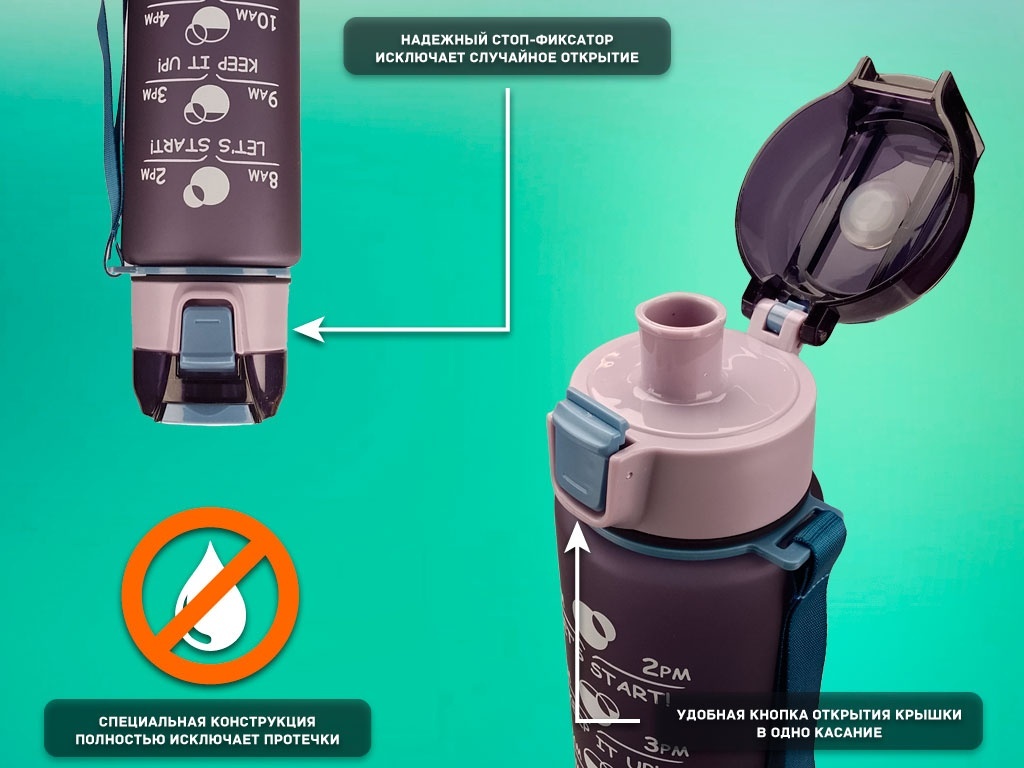 Объём бутылки в 1 литр позволит вам поддерживать водный баланс в течение всего дня — будь то тренировка, прогулка или рабочий день. Эта бутылка создана для тех, кто ценит удобство и надёжность. Герметичная крышка надёжно защитит содержимое от протекания, а удобная петелька облегчит переноску — просто прикрепите бутылку к рюкзаку или сумке.