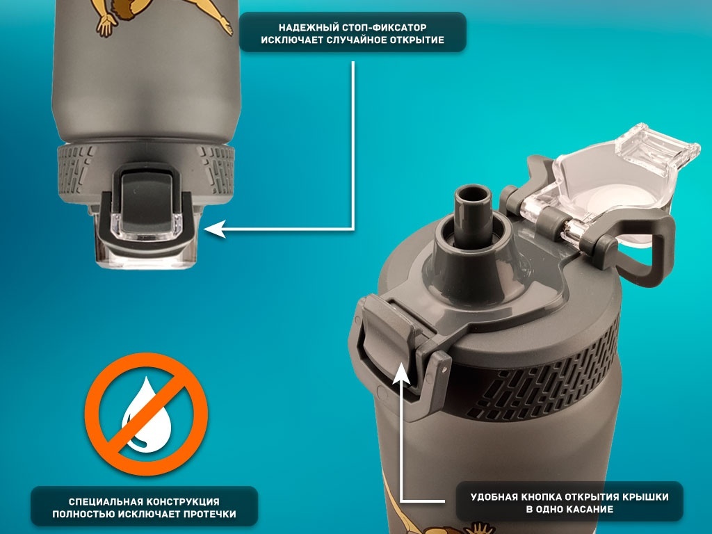 - Оптимальный объём — 1200 мл: достаточно жидкости на целый день, при этом бутылка остаётся компактной и удобной.