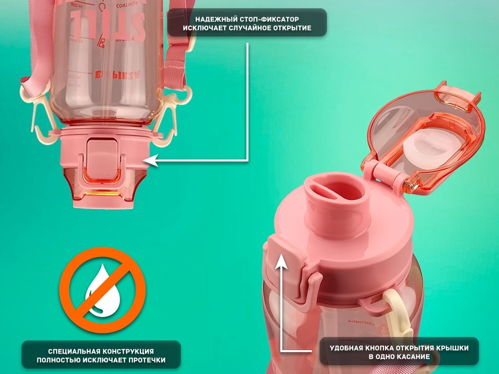Объём бутылки в 1.5 литра позволит вам поддерживать водный баланс в течение всего дня — будь то тренировка, прогулка или рабочий день. Эта бутылка создана для тех, кто ценит удобство и надёжность. Герметичная крышка надёжно защитит содержимое от протекания, а удобная петелька облегчит переноску — просто прикрепите бутылку к рюкзаку или сумке.