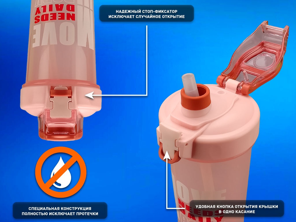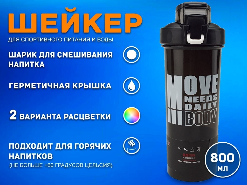 Дизайн с мотивирующей надписью «MOVE NEEDS DAILY BODY» будет напоминать вам о важности движения и заботы о своём теле. Оставайтесь в тонусе с нашим шейкером!