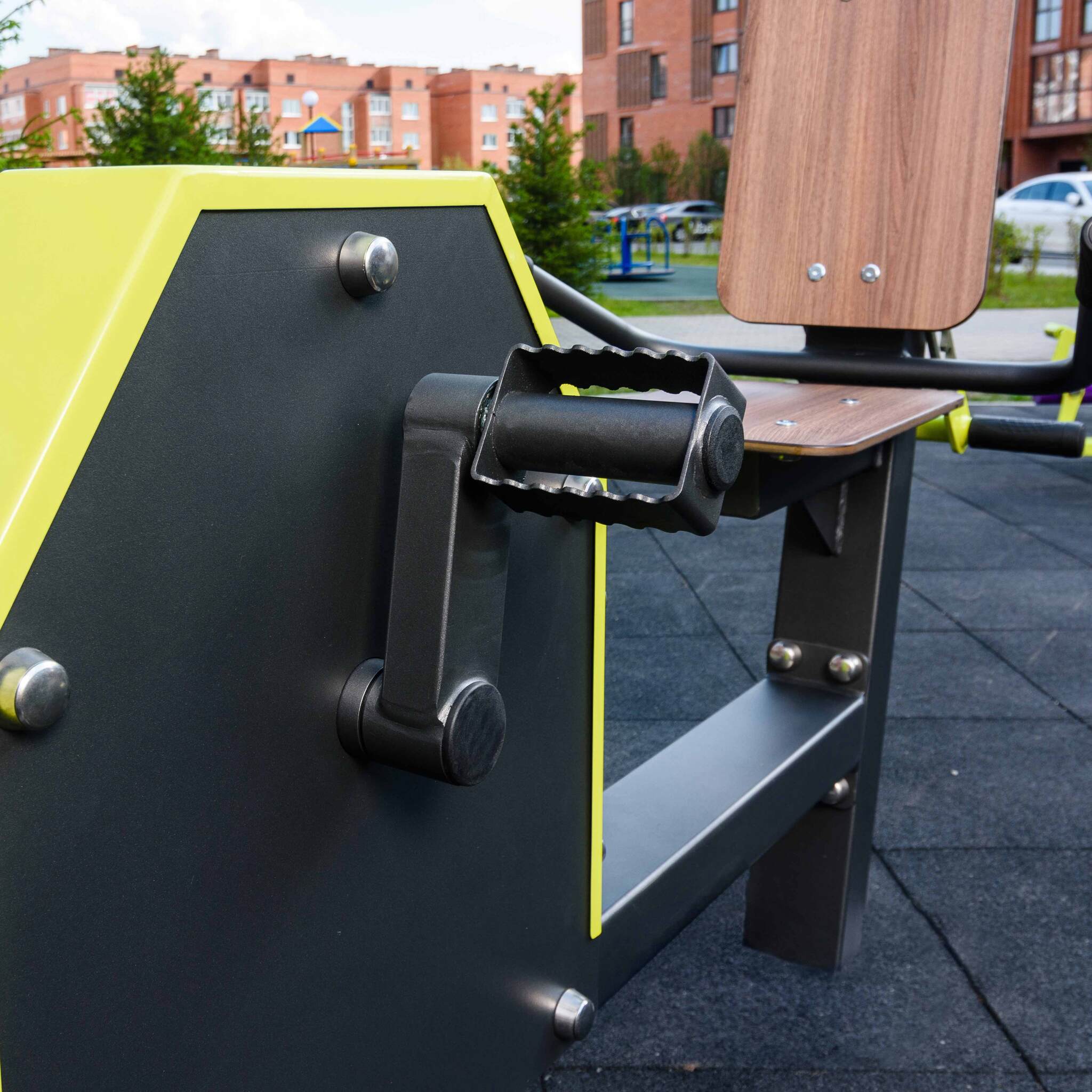 Несущая конструкция уличного тренажера выполнена из профильной трубы 120×80 мм с толщиной стенки 3 мм. Детали изготовлены из листового металла толщиной 8 мм и 4 мм.