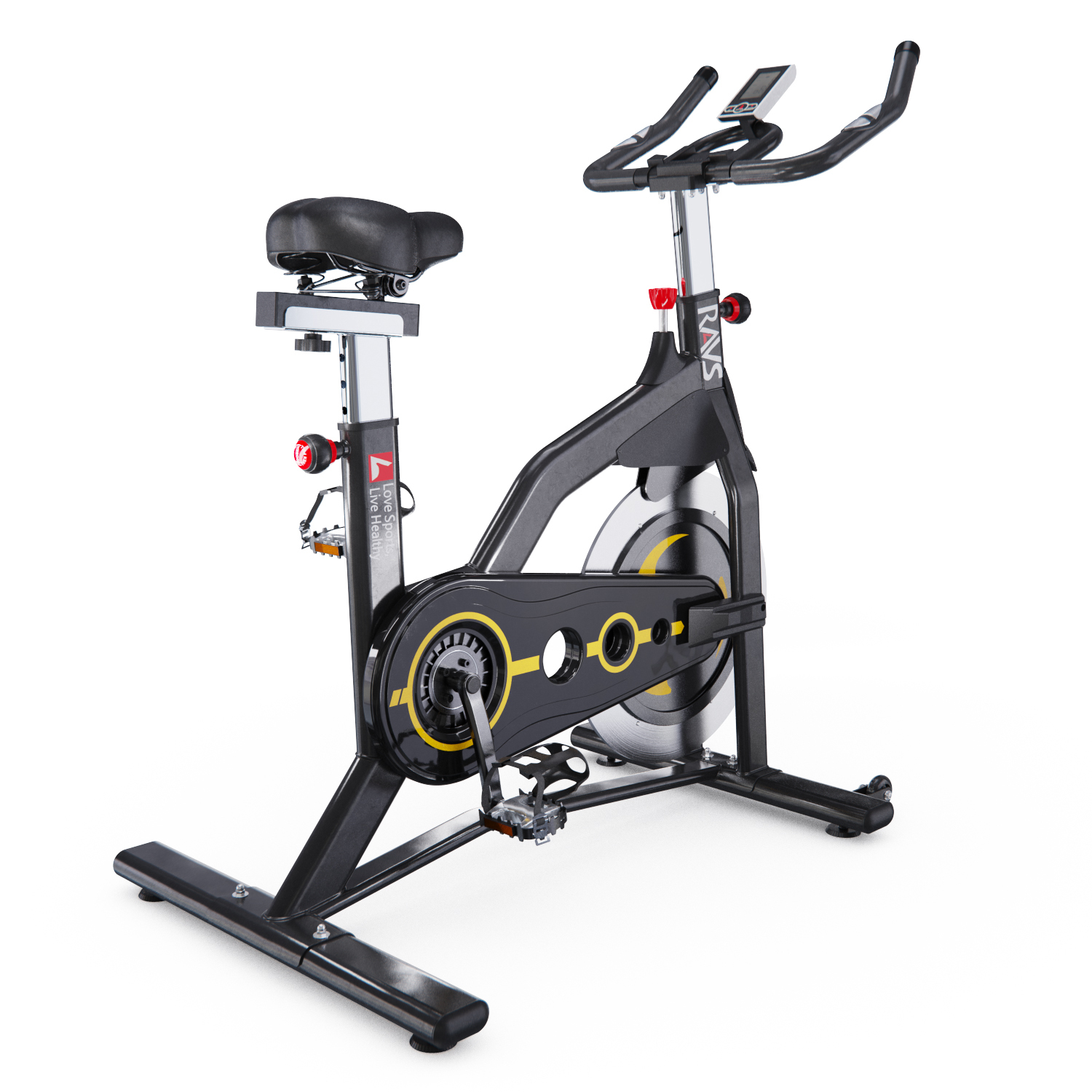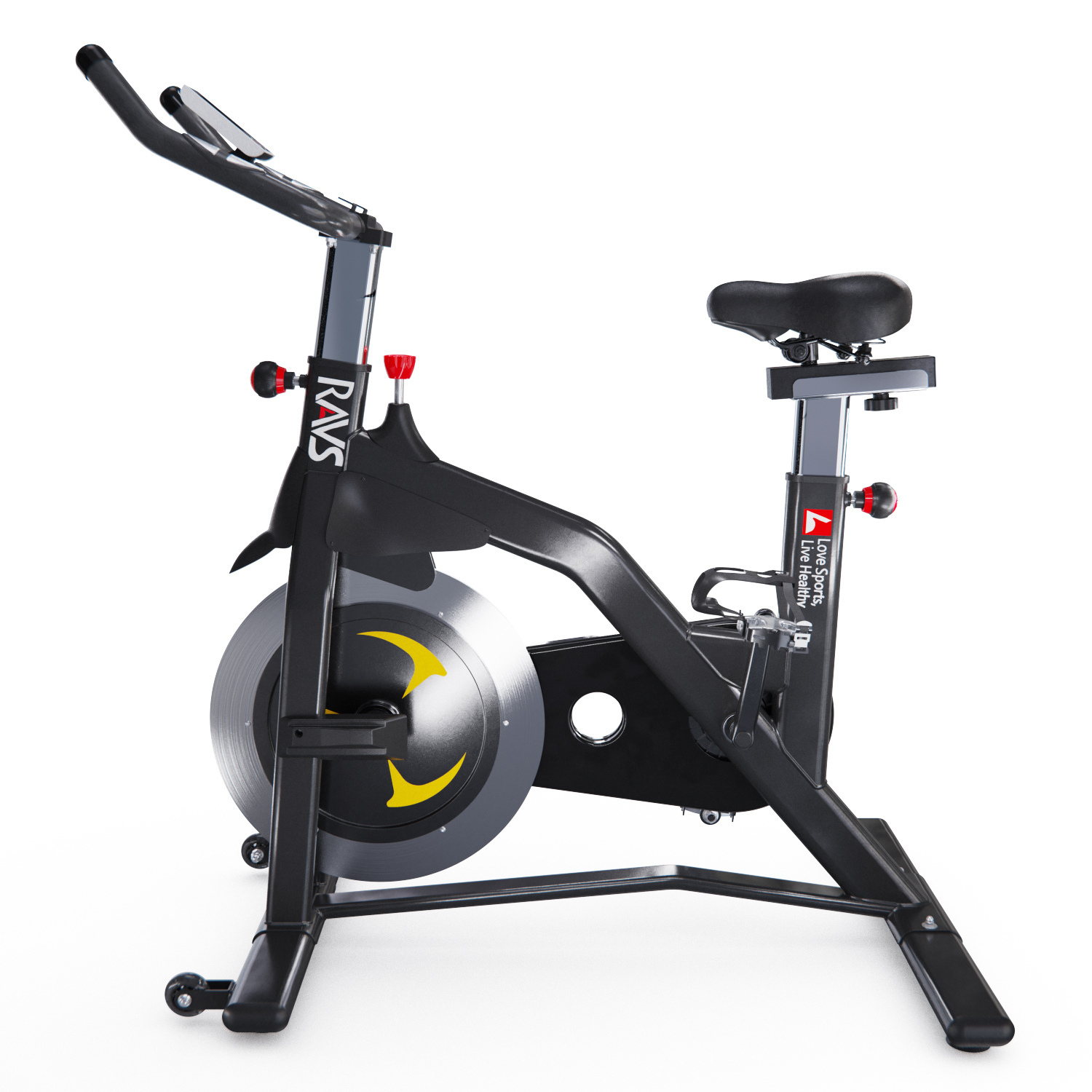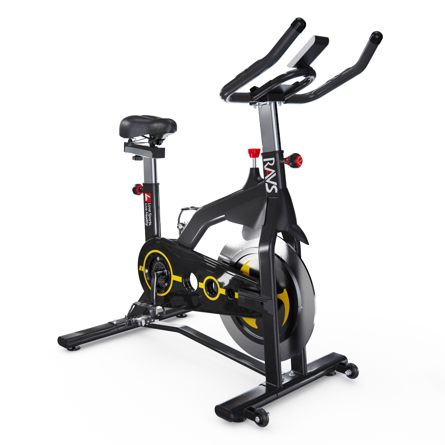 Спин-байк RAVS чёрного цвета имеет прочную стальную раму, что повышает его устойчивость и обеспечивает быструю езду. Он также оснащен большим алюминиевым маховиком с инерционным весом 19 кг, который обеспечивает дополнительный импульс и реалистичные ощущения от езды с препятствиями. Максимальный вес пользователя до 150 кг.