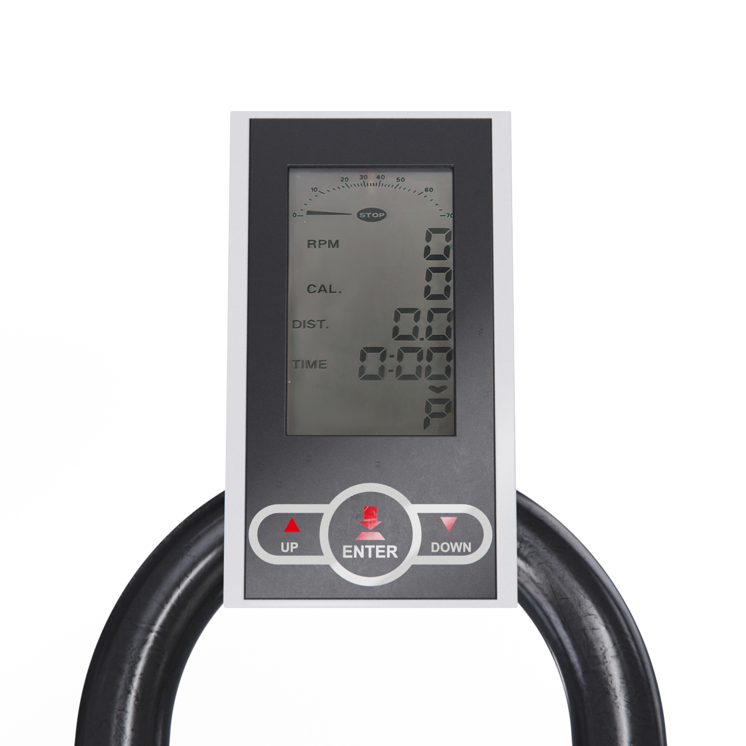 Магнитный велотренажер оснащен жидкокристаллическим дисплеем и датчиком частоты сердечных сокращений, который отслеживает вашу скорость, количество оборотов в минуту, сожженные калории, пройденное расстояние и время тренировки.
