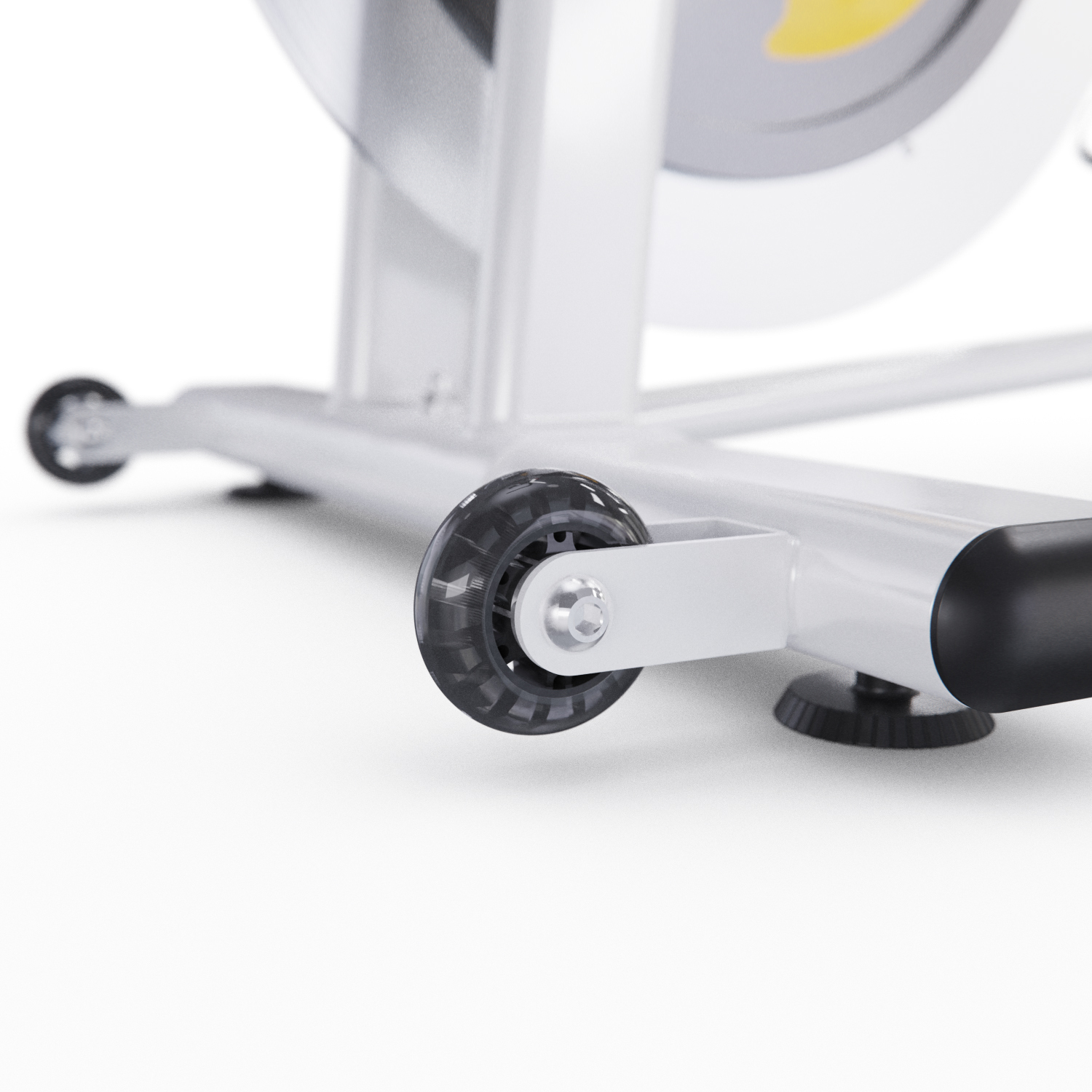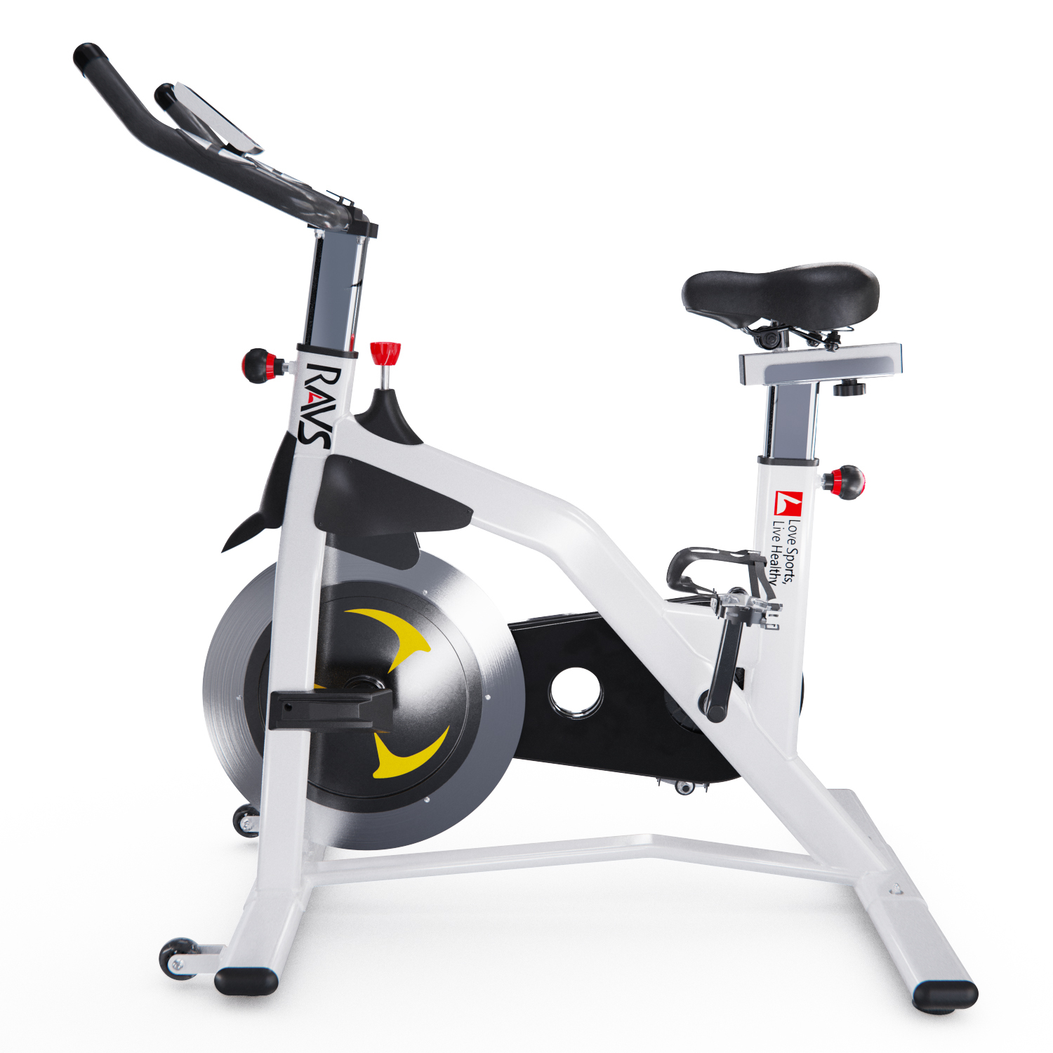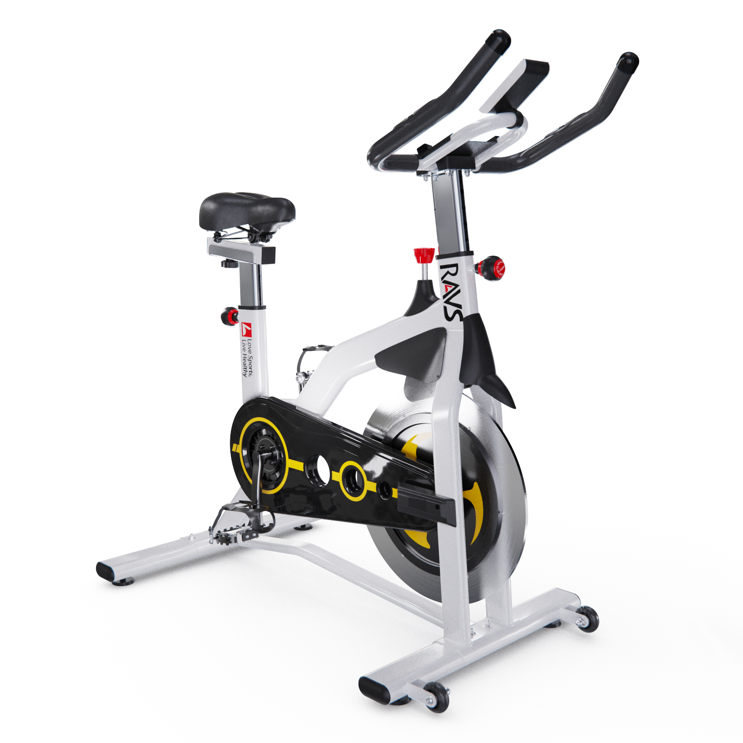 Спин-байк RAVS белого цвета имеет прочную стальную раму, что повышает его устойчивость и обеспечивает быструю езду. Он также оснащен большим алюминиевым маховиком с инерционным весом 19 кг, который обеспечивает дополнительный импульс и реалистичные ощущения от езды с препятствиями. Максимальный вес пользователя до 150 кг.