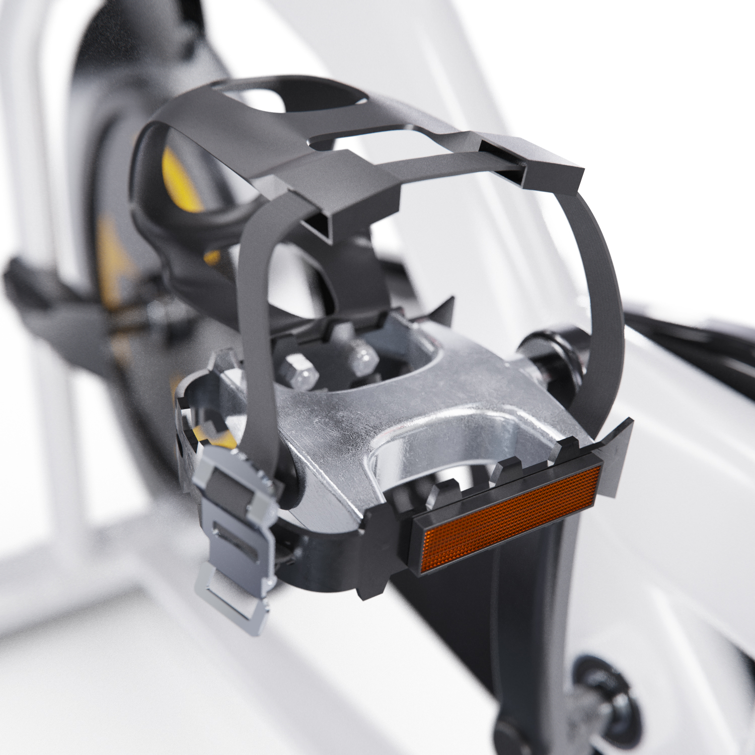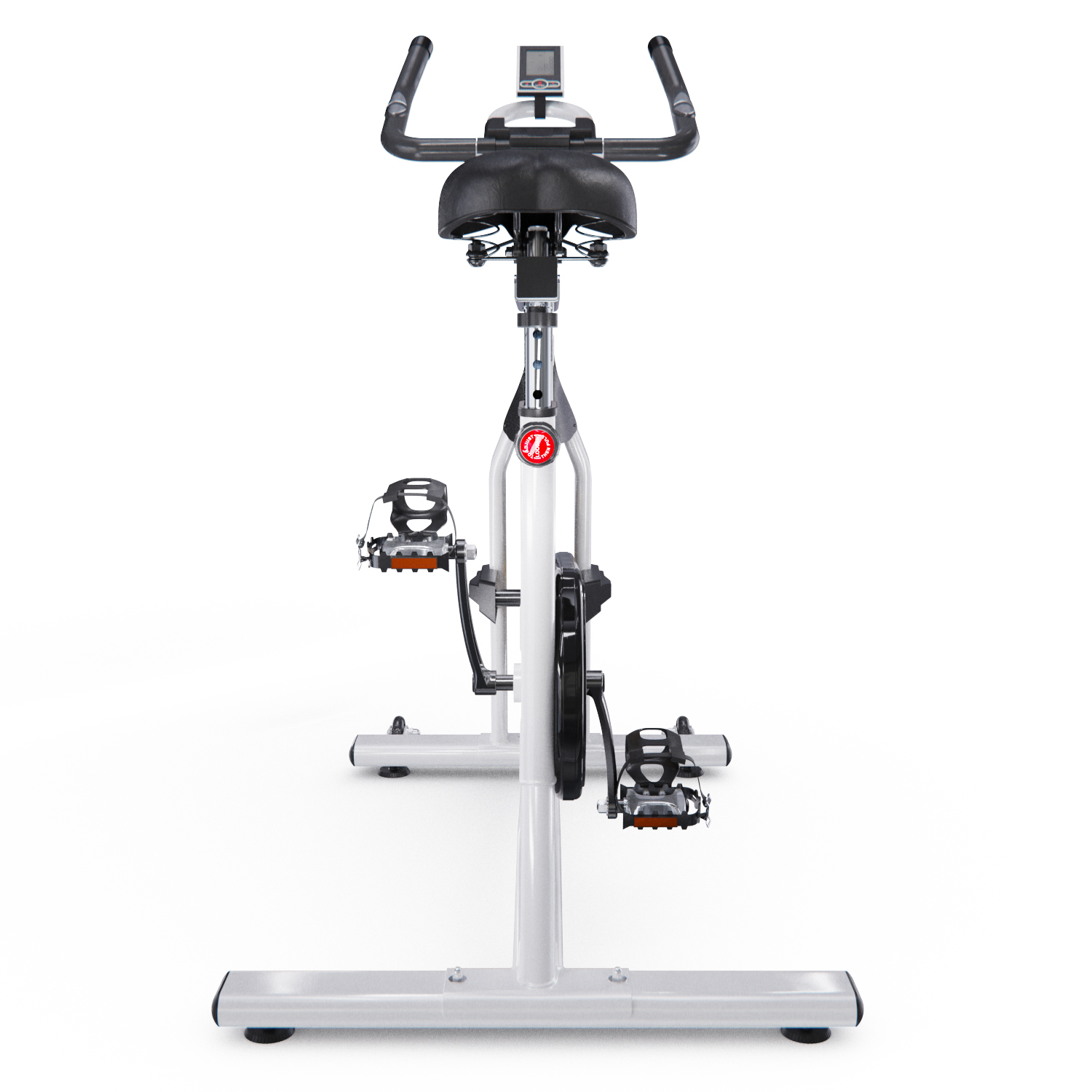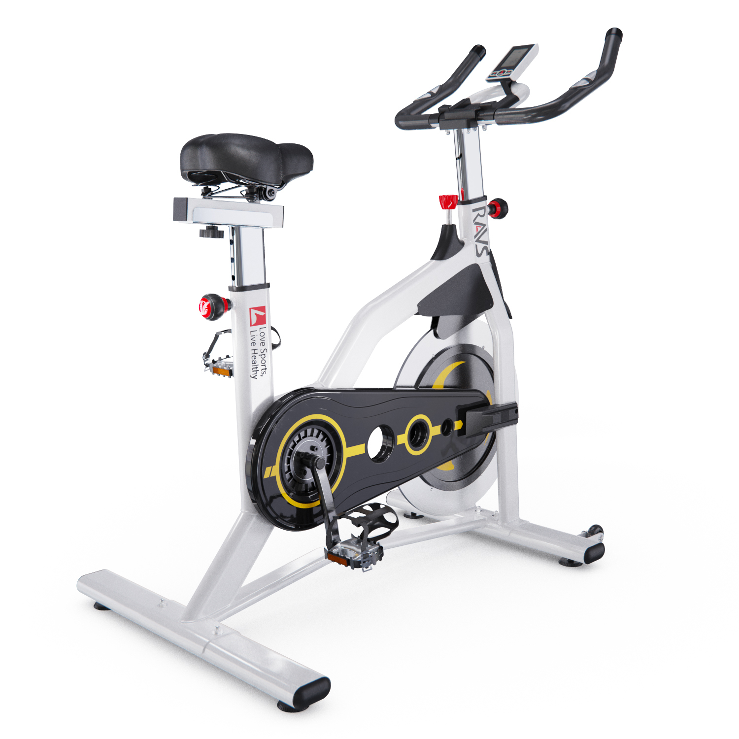 Спин-байк RAVS белого цвета имеет прочную стальную раму, что повышает его устойчивость и обеспечивает быструю езду. Он также оснащен большим алюминиевым маховиком с инерционным весом 19 кг, который обеспечивает дополнительный импульс и реалистичные ощущения от езды с препятствиями. Максимальный вес пользователя до 150 кг.