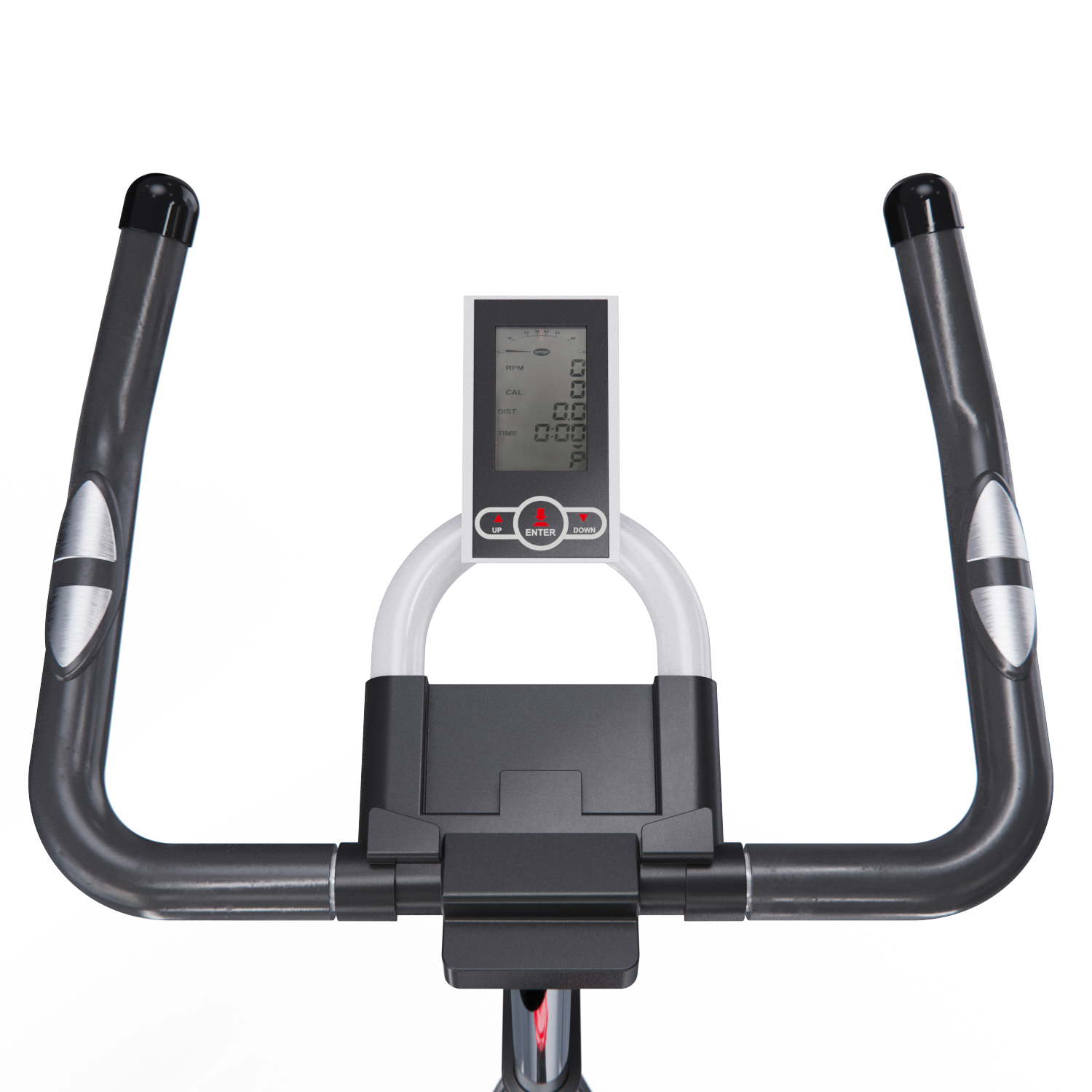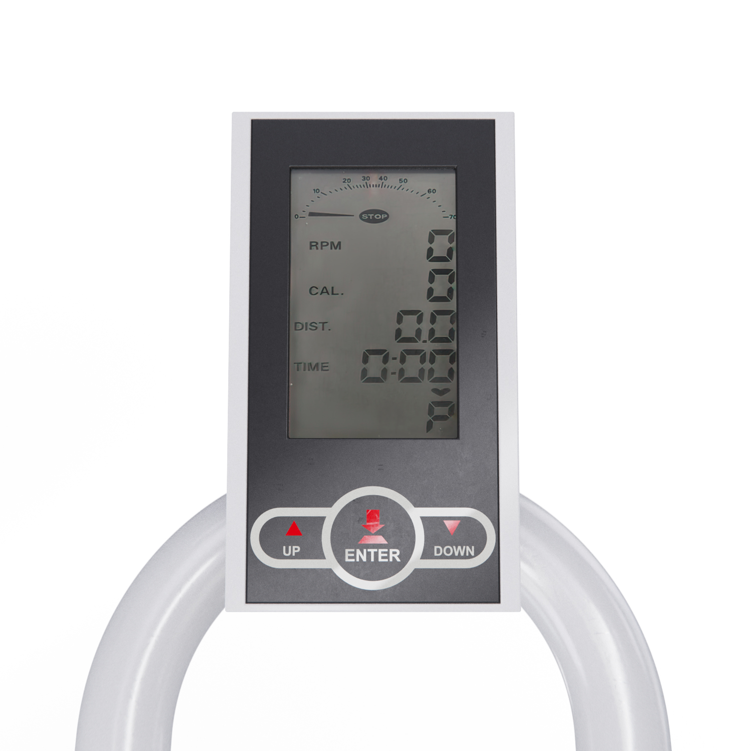 Магнитный велотренажер оснащен жидкокристаллическим дисплеем и датчиком частоты сердечных сокращений, который отслеживает вашу скорость, количество оборотов в минуту, сожженные калории, пройденное расстояние и время тренировки.