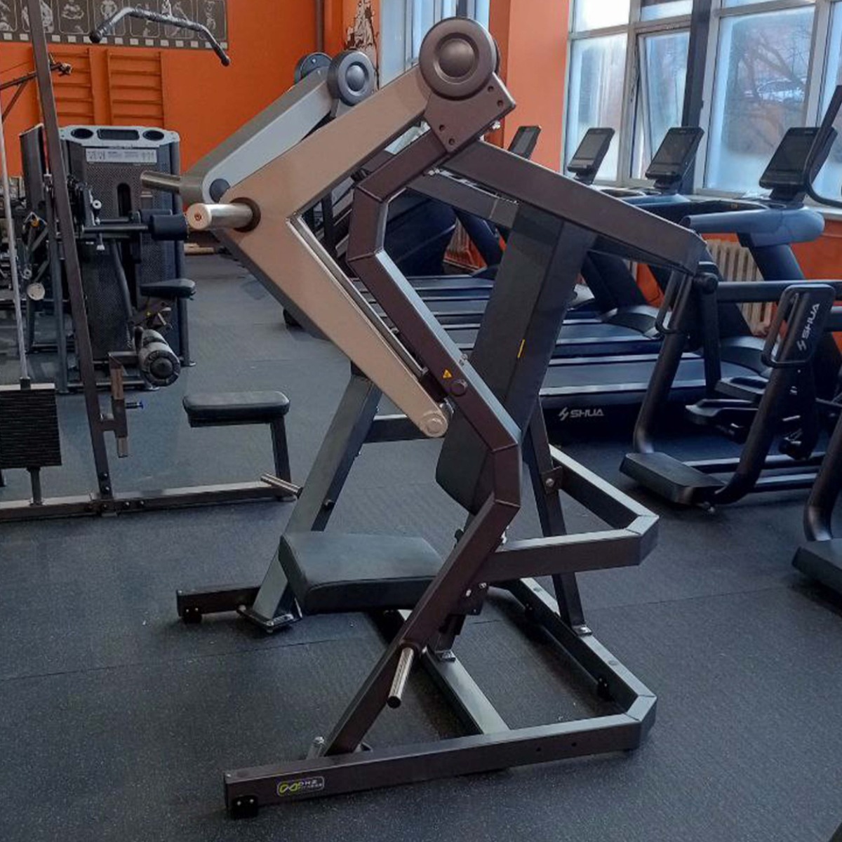 Накопители на подвижных рычагах и статичные для хранения оборудованы кольцами (демпферами) из плотной резины толщиной 20 мм для предотвращения соприкосновения дисков с рамой тренажера и амортизации при размещении свободных весов на накопителях.