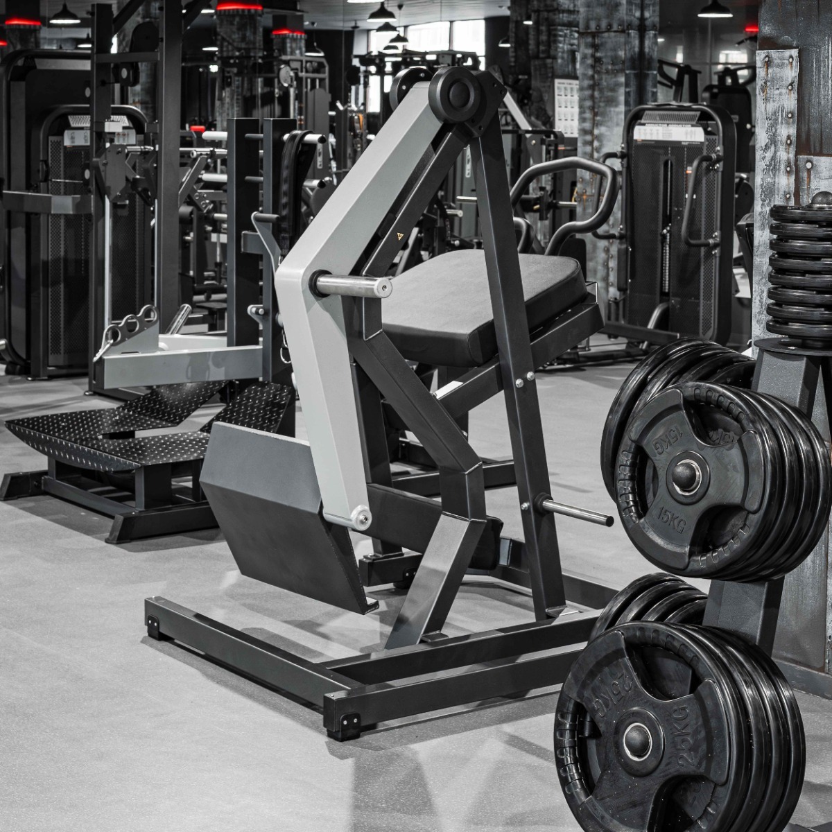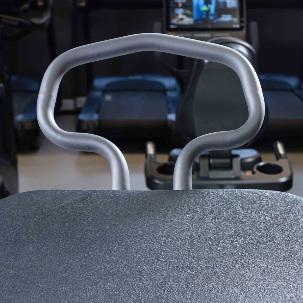 Накопитель на подвижном рычаге и статичный для хранения оборудованы кольцами из плотной резины толщиной 20 мм для предотвращения соприкосновения дисков с рамой тренажера и амортизации при размещении свободных весов на накопителях.