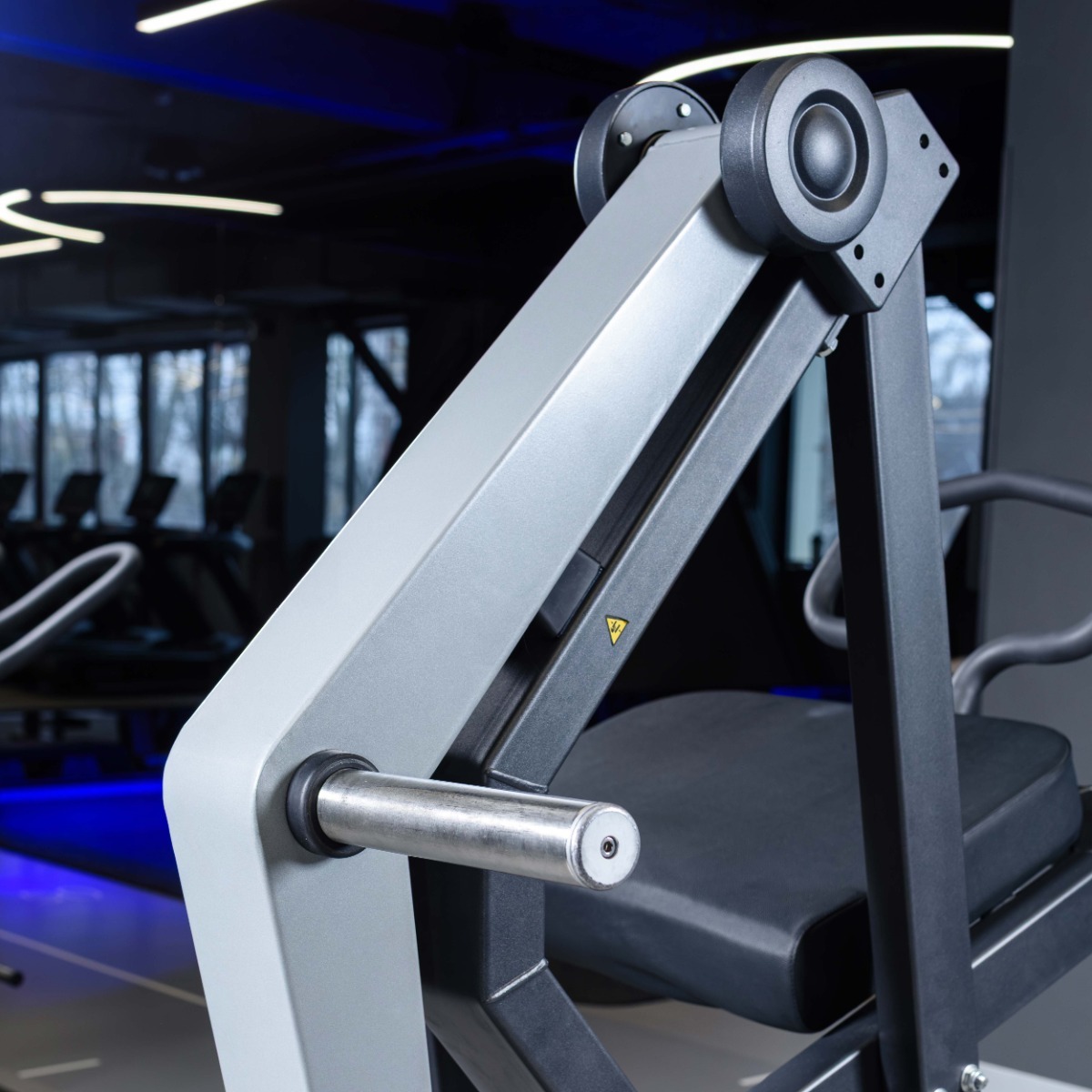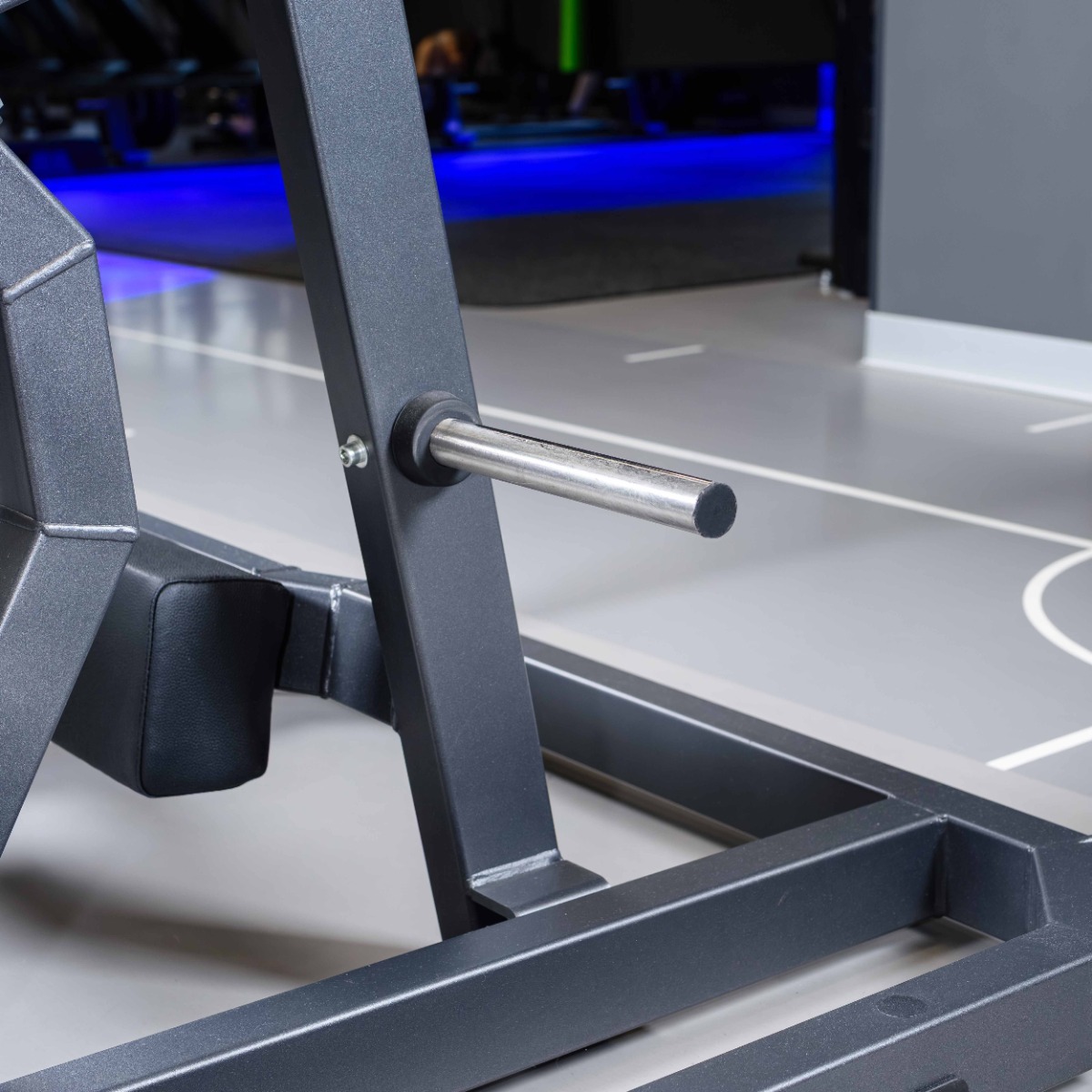 На подвижном рычаге для работы со свободными весами установлен один литой хромированный накопитель из толстостенной стальной трубы длиной 285 мм (рабочая длина 265 мм без учета заглушек и демпферов) для дисков с посадочным диаметром 50 мм. На торце при помощи болта закреплена металлическая заглушка.