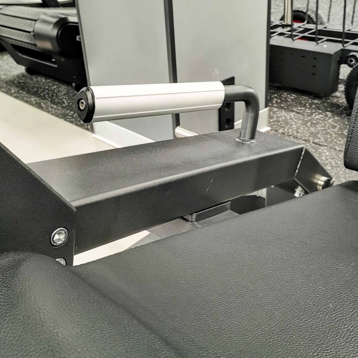 На подвижном рычаге для работы со свободными весами установлен один литой хромированный накопитель из толстостенной стальной трубы длиной 380 мм (рабочая длина 355 мм без учета заглушек и демпферов) для дисков с посадочным диаметром 50 мм. На торце при помощи болта закреплена металлическая заглушка.