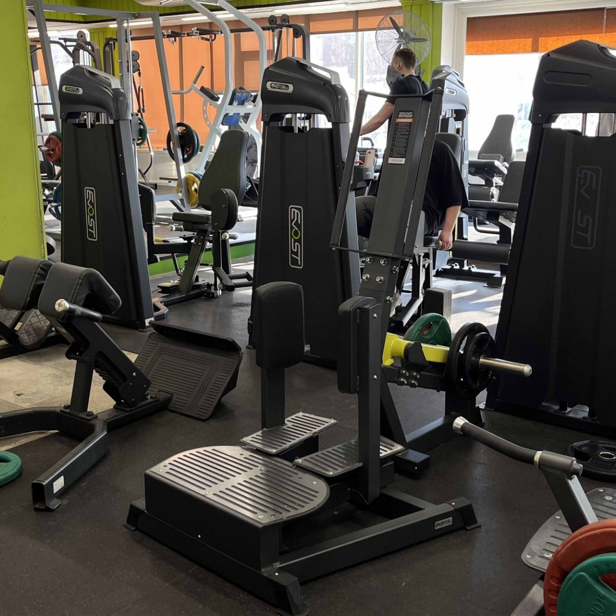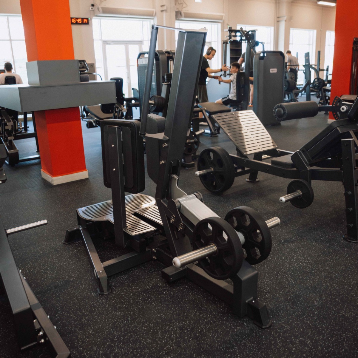 Накопители на подвижном рычаге оборудованы кольцами из плотной резины для предотвращения соприкосновения дисков с рамой тренажера и амортизации при размещении свободных весов на накопителях.