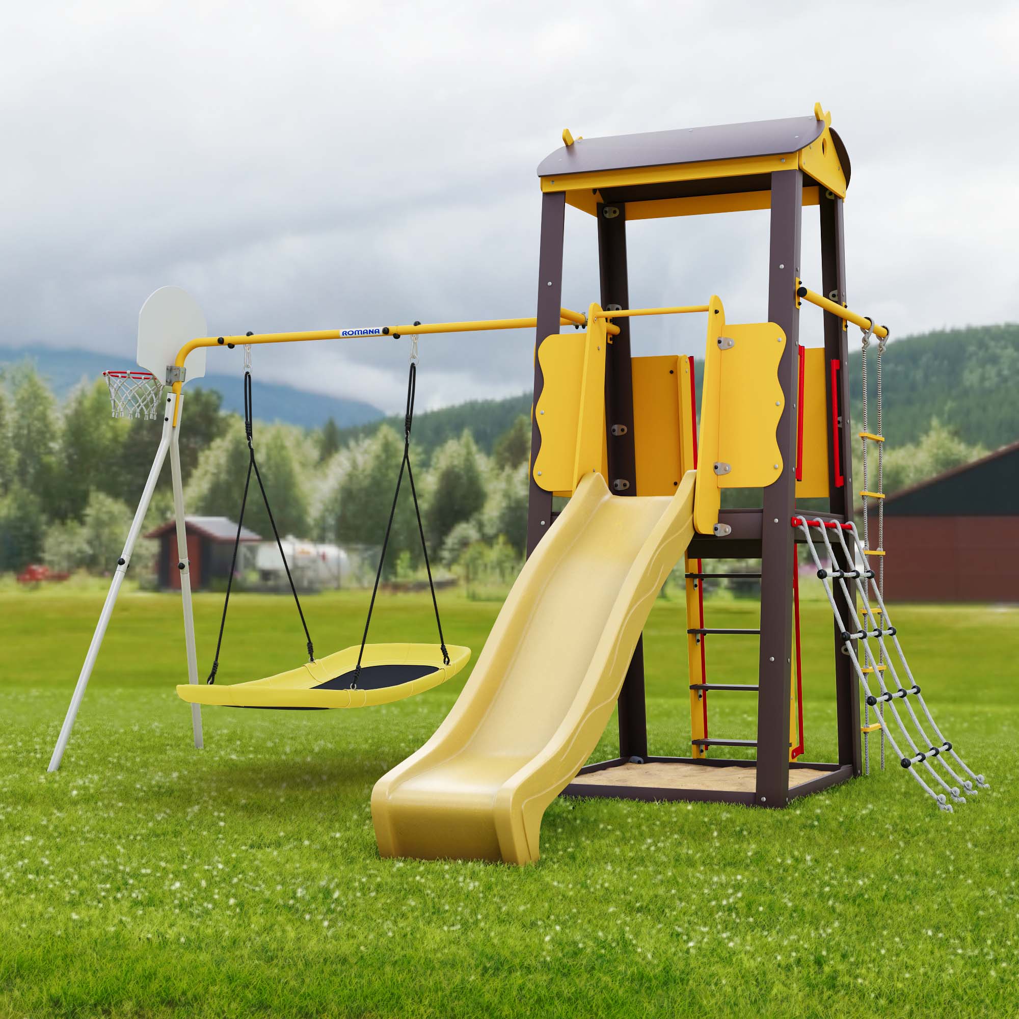 ROMANA «Избушка» — это море веселья, забав и активных игр. В комплекте есть песочница и пластиковая горка, баскетбольный щит, а также двое качелей — дети могут не спорить за право покататься первым. Помимо этого, здесь есть канатный лаз из шнура повышенной прочности. Навесное оборудование атмосферостойкое — в природных условиях оно прослужит гораздо дольше. Если вы хотите веселого и запоминающегося лета на природе — ROMANA «Избушка» приведет в восторг маленьких любителей приключений!