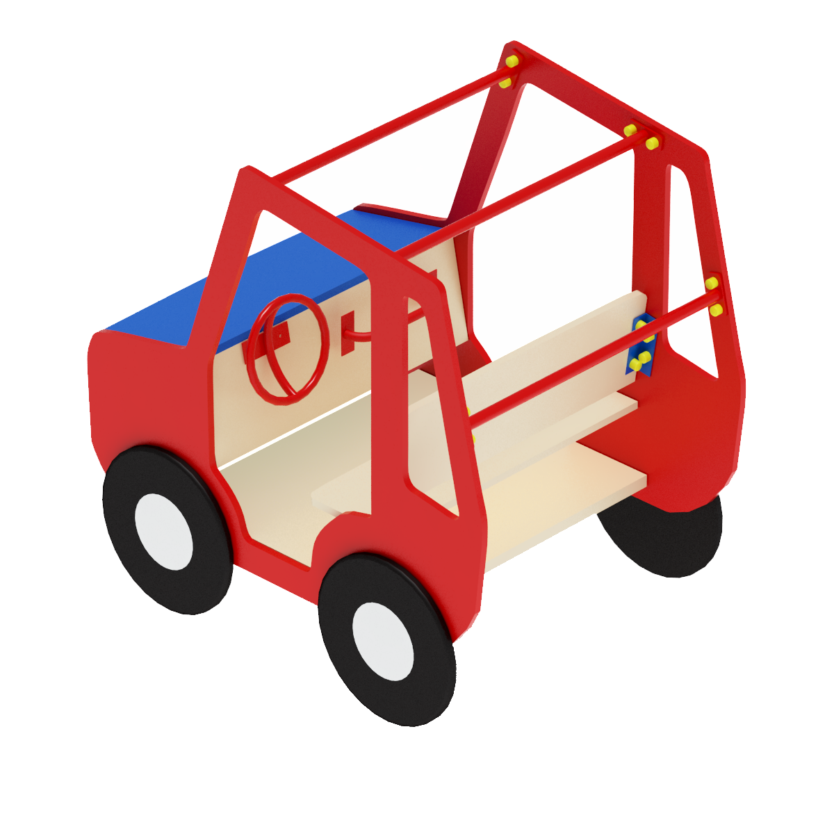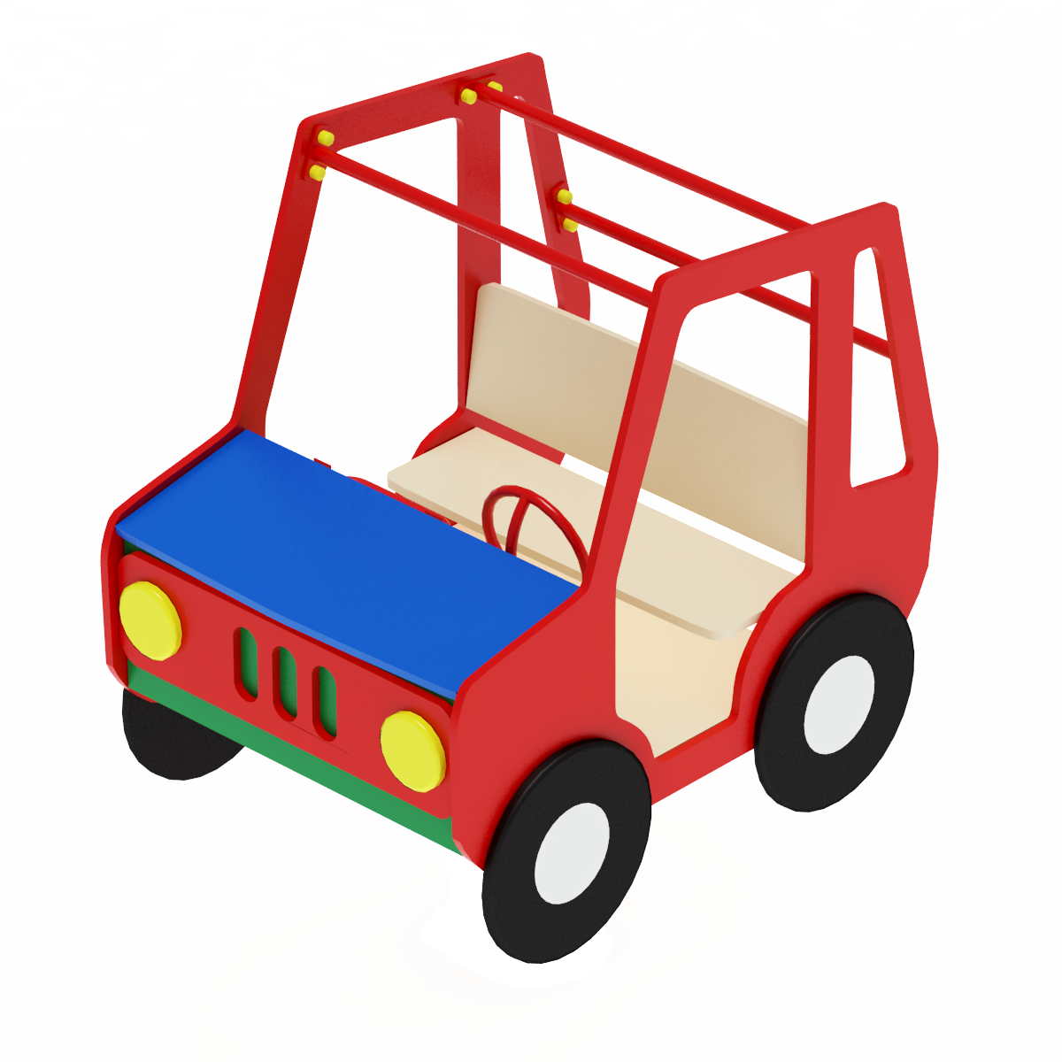 Комплекс включает в себя: каркас опорный, который выполнен из уголков 40х40х4, сиденье выполнено из влагостойкой фанеры толщиной 18 мм, спинка сиденья выполнена из влагостойкой фанеры толщиной 18 мм, пол выполнен из ламинированной фанеры с антискользящим покрытием 700х820х18, руль выполнен из стальной трубы диаметром 22 мм, борта стилизованы под машину и выполнены из влагостойкой фанеры толщиной 18 мм и состоят из боковых бортов размером 1200х1000х18 - 2 шт, капота 820х400х18 -1 шт., приборной панели (820х250х18), передней панели (820х450х18), колес ( диаметром 400 мм толщина фанеры 9 мм), на передней панели имеются фары из фанеры толщиной 9 мм, диаметром 120 мм и решетка радиатора (690х220х9).
