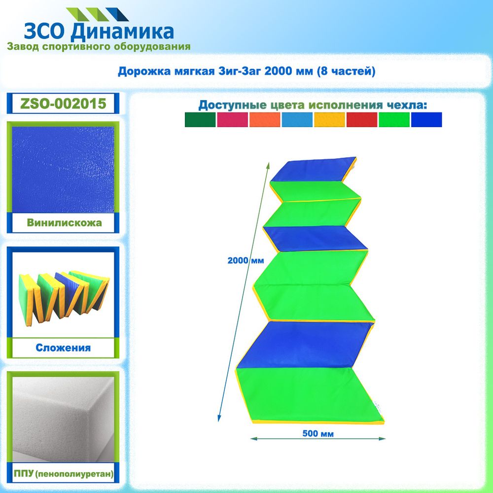 Дорожка ЗИГ-ЗАГ 2000 мм представляет собой сшитые между собой мягкие блоки, сшитые из винилискожи и наполнителя - прочного поролона (ППУ - пенополиуретан плотностью 19,3 кг/м3). У модулей имеется молния со скрытыми замками для замены наполнителя.