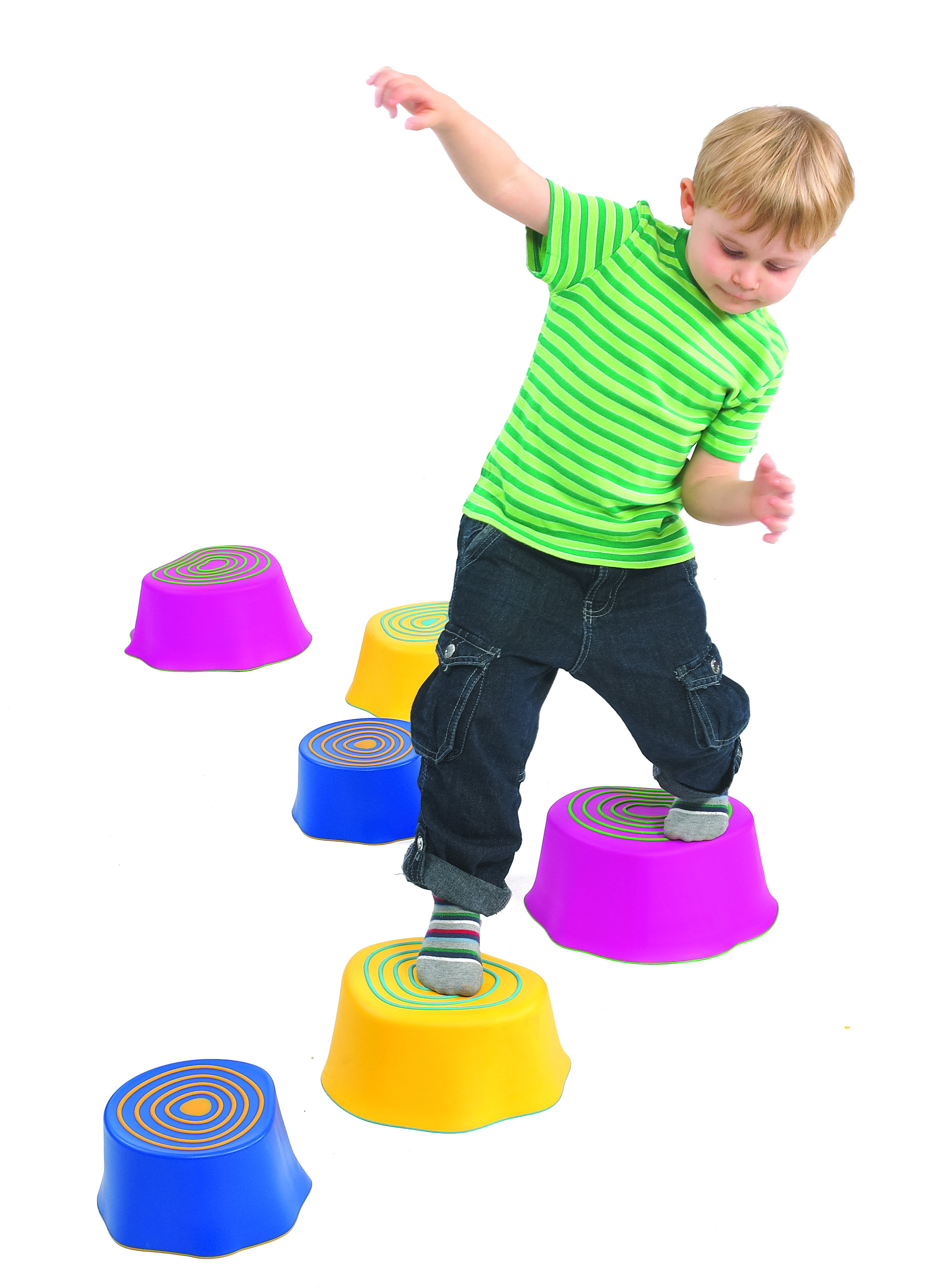 Пенёчки имеют текстурированную верхнюю поверхность, что позволяет детям безопасно балансировать, а прорезиненные нижние края предотвращают скольжение.