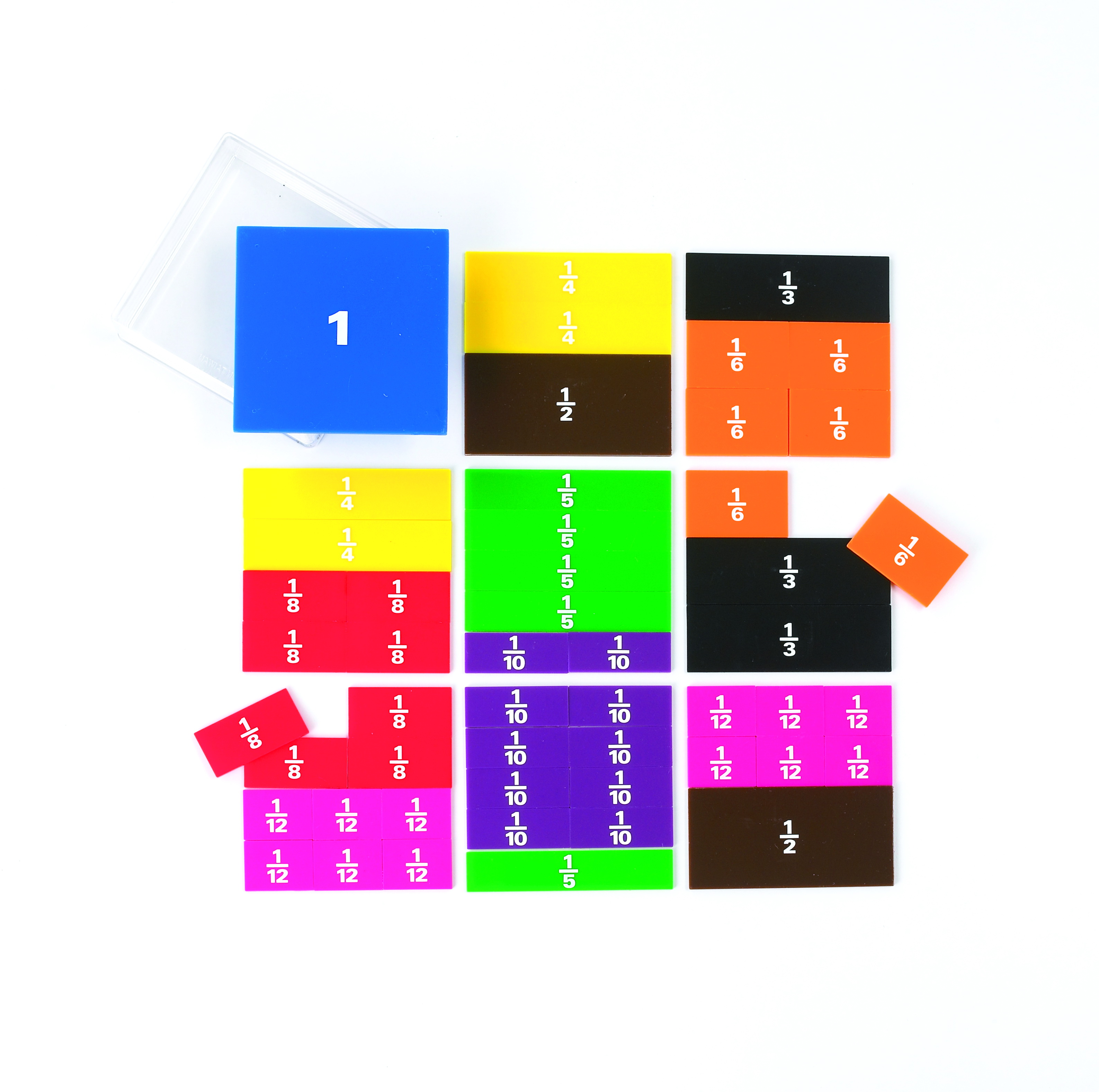 Набор состоит из 51 пропорциональных частей квадрата, демонстрирующие целые и половинные значения, третьи, четвертые, пятые, шестые, восьмые, десятые и двенадцатые части, напечатанных на каждом квадрате. Размеры квадрата: 10 х 10 см.