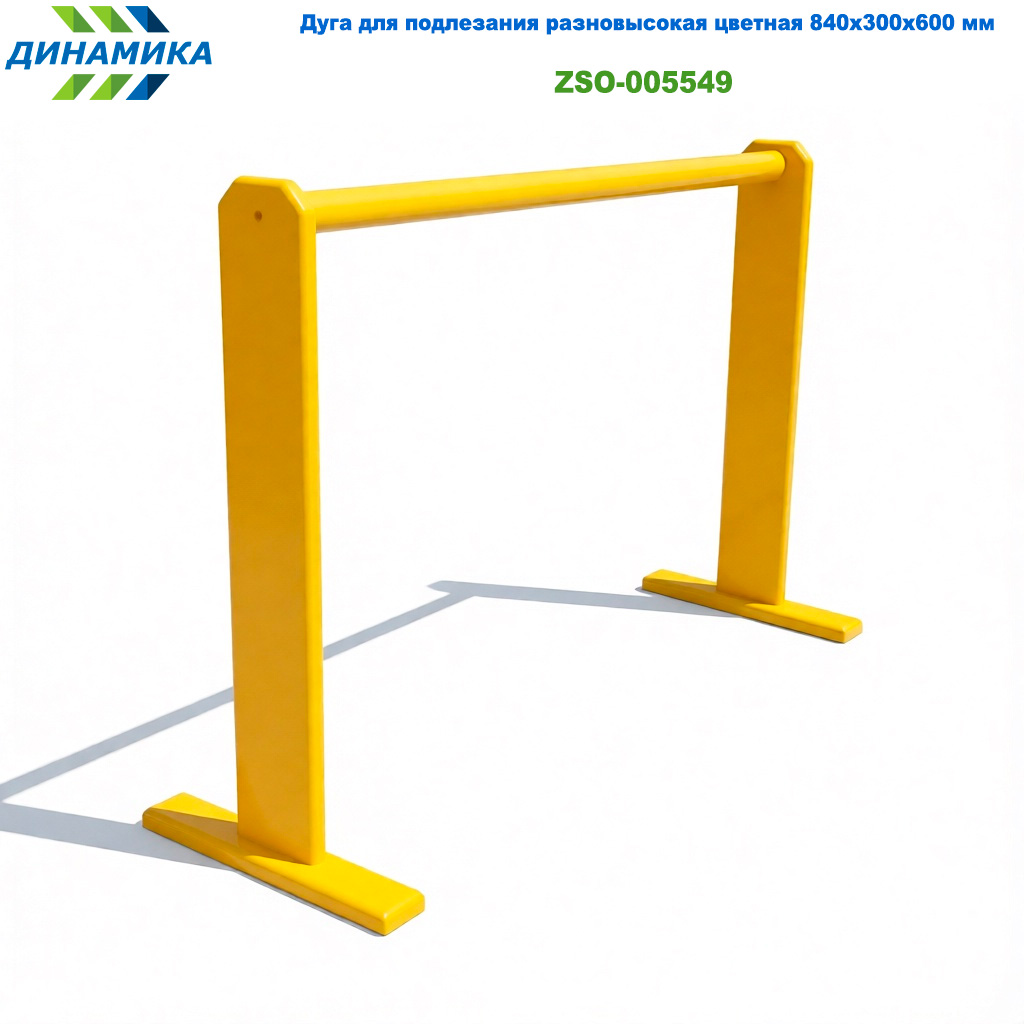 Дуга для подлезания разновысокая представляет собой прямоугольную дугу, состоящая из горизонтальных перекладин (береза) и боковин с опорами из многослойной березовой фанеры. В целях безопасности все края и углы закруглены. Поверхность изделия тщательно отшлифована и покрыта эмалью глянцевой ЕВРО. Поставляется в собранном виде.