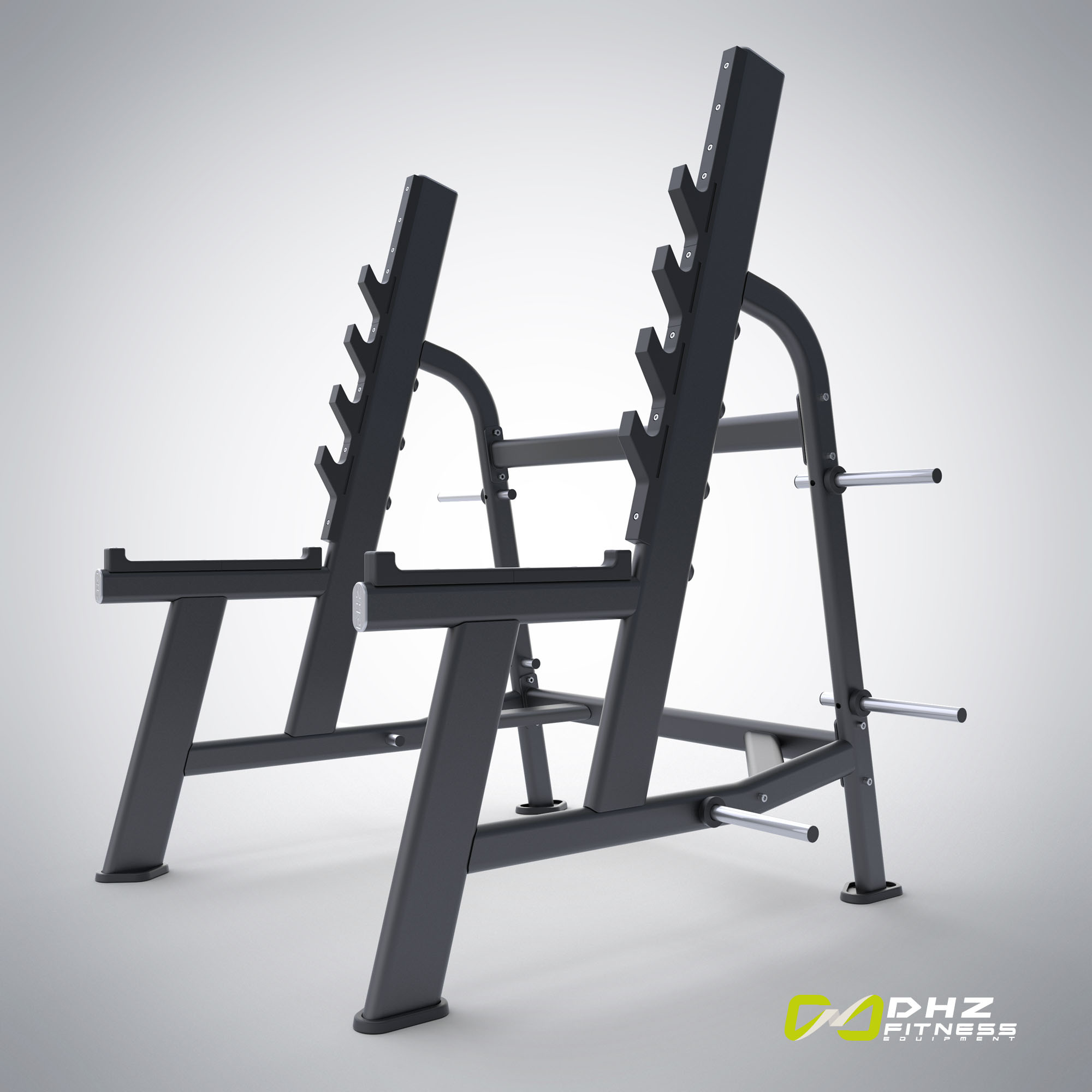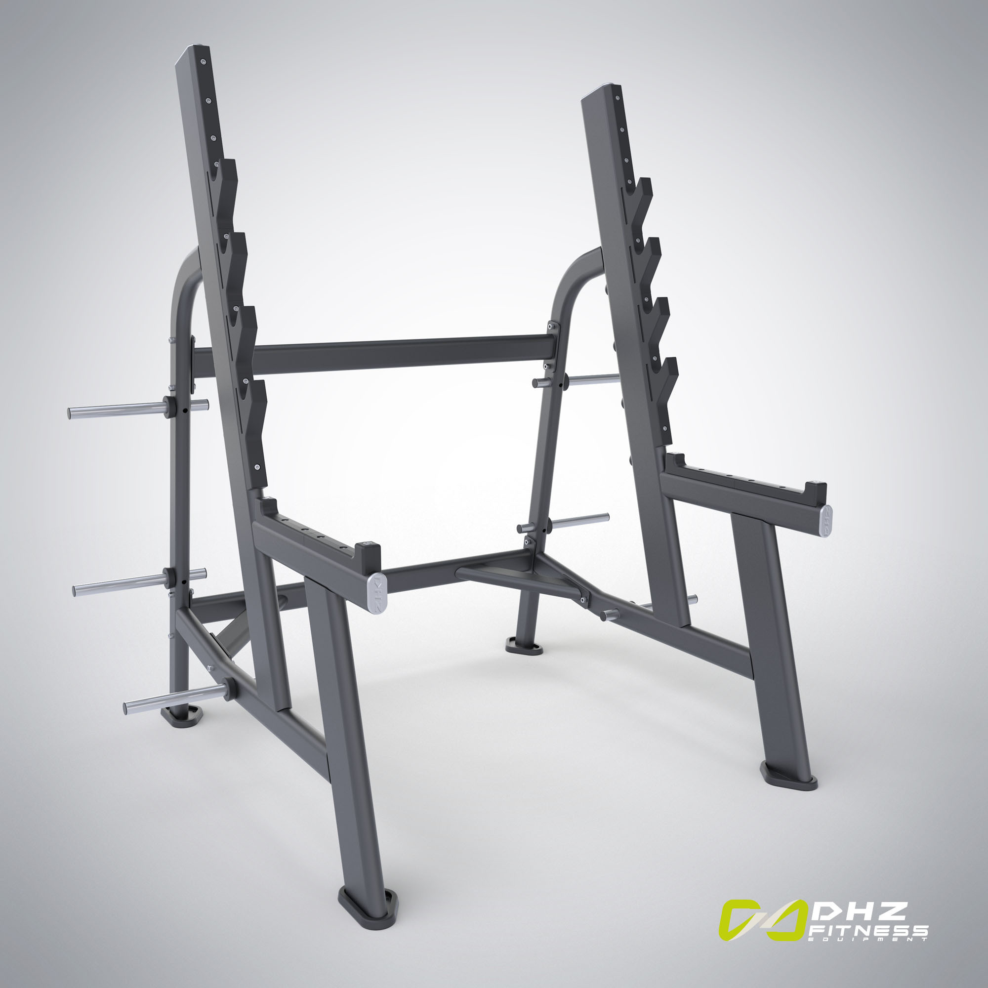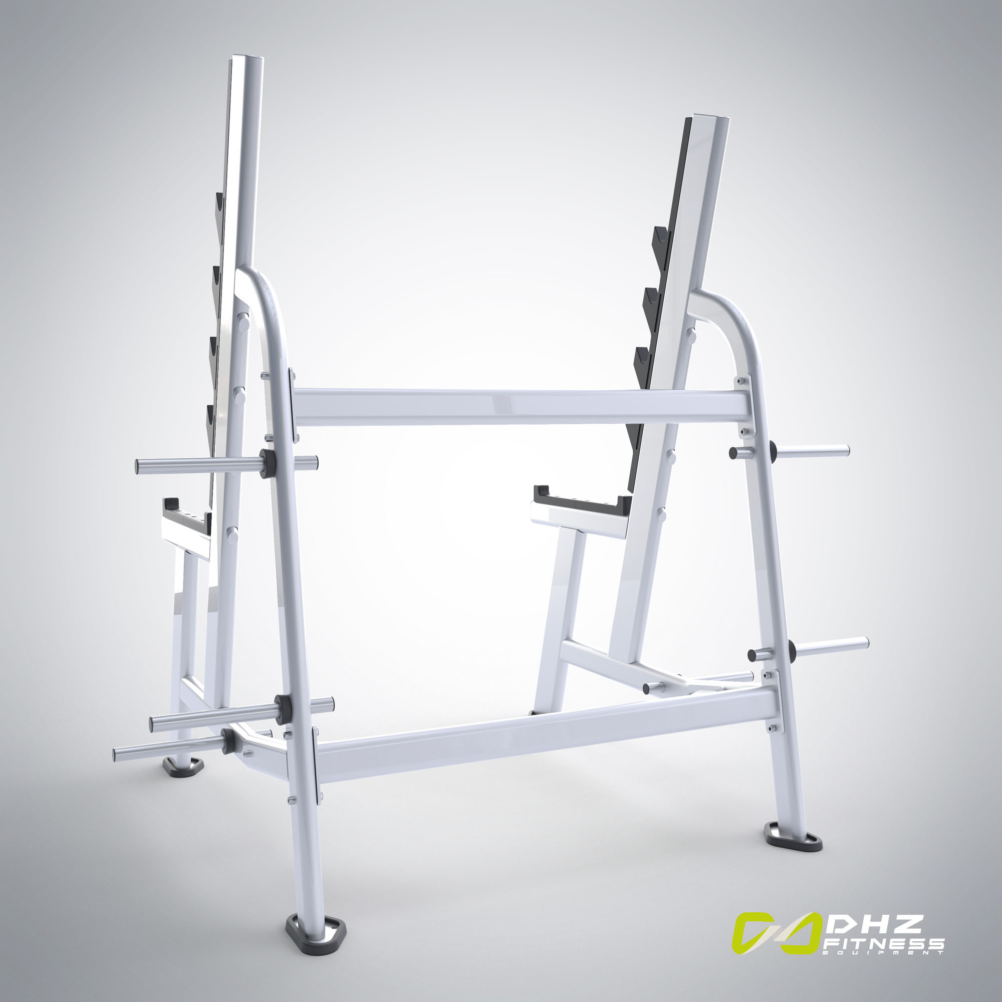 На раме тренажера закреплены четырёхуровневые опоры из пластика с ложементами для фиксации штанги и предотвращения механического воздействия на раму и покрытие.