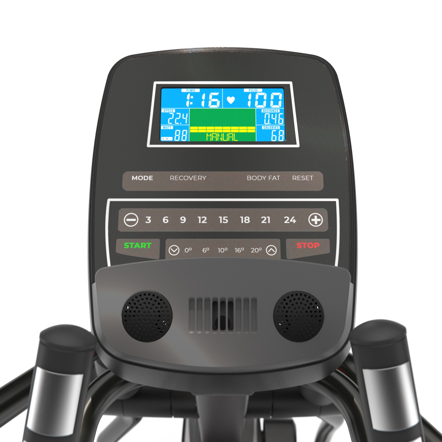 Эллептик DFC E180 оснащён магнитной системой нагрузки с электронной регулировкой: 24 уровня регулируются с панели управления. Предустановлены 12 программ тренировок, 3 пользовательских и 1 с руководством. Также на 5-тидюймовом LCD дисплее отображаются время, пульс, скорость, уровень нагрузки и другие параметры занятия. На передней консоли также есть подставка под планшет. С консоли можно регулировать угол наклона на 5 уровнях от — 0 до 20 градусов.