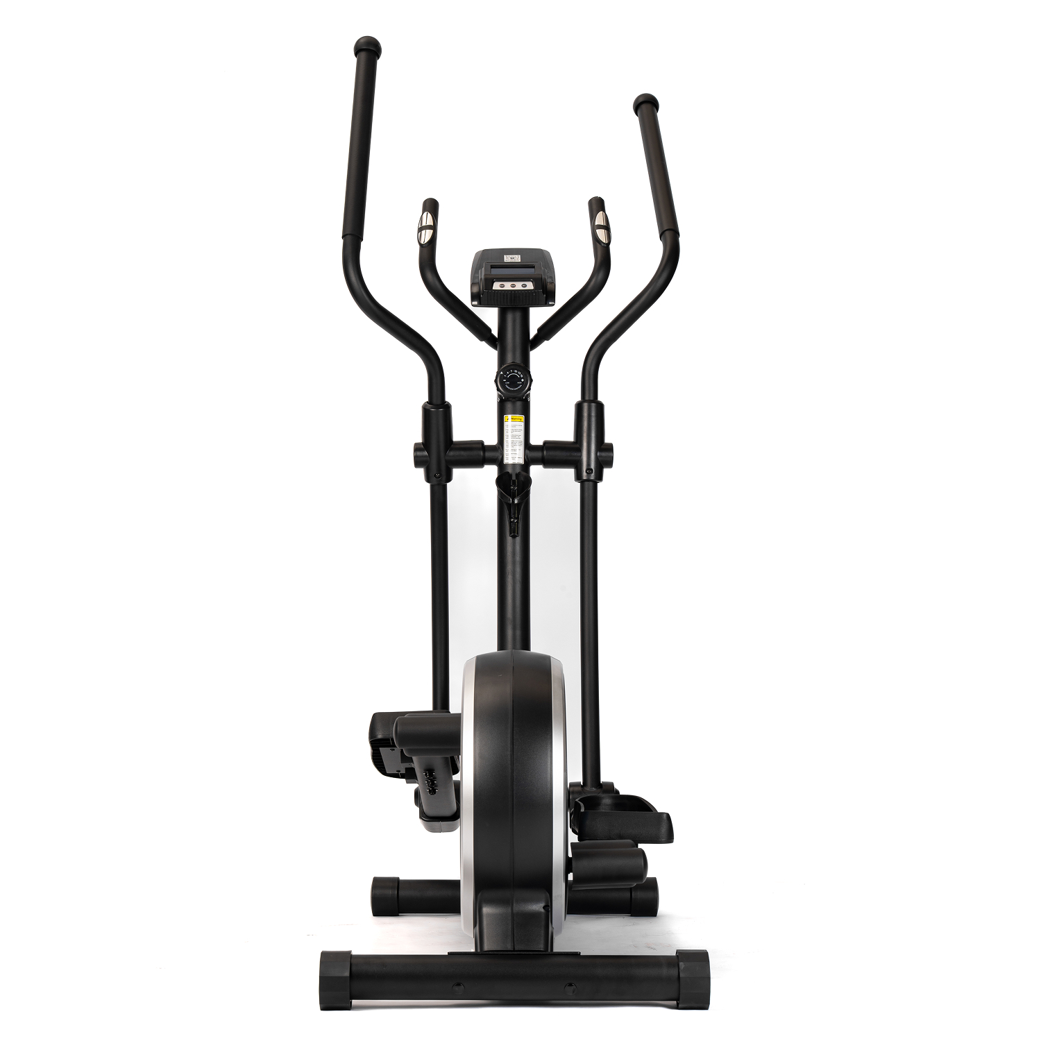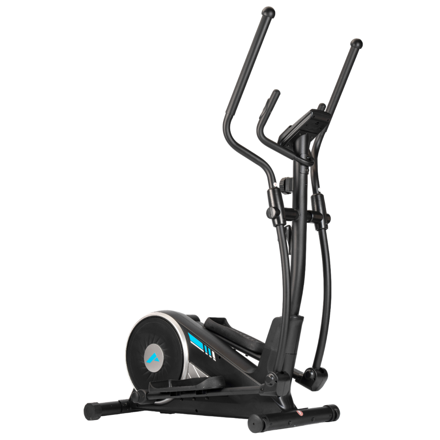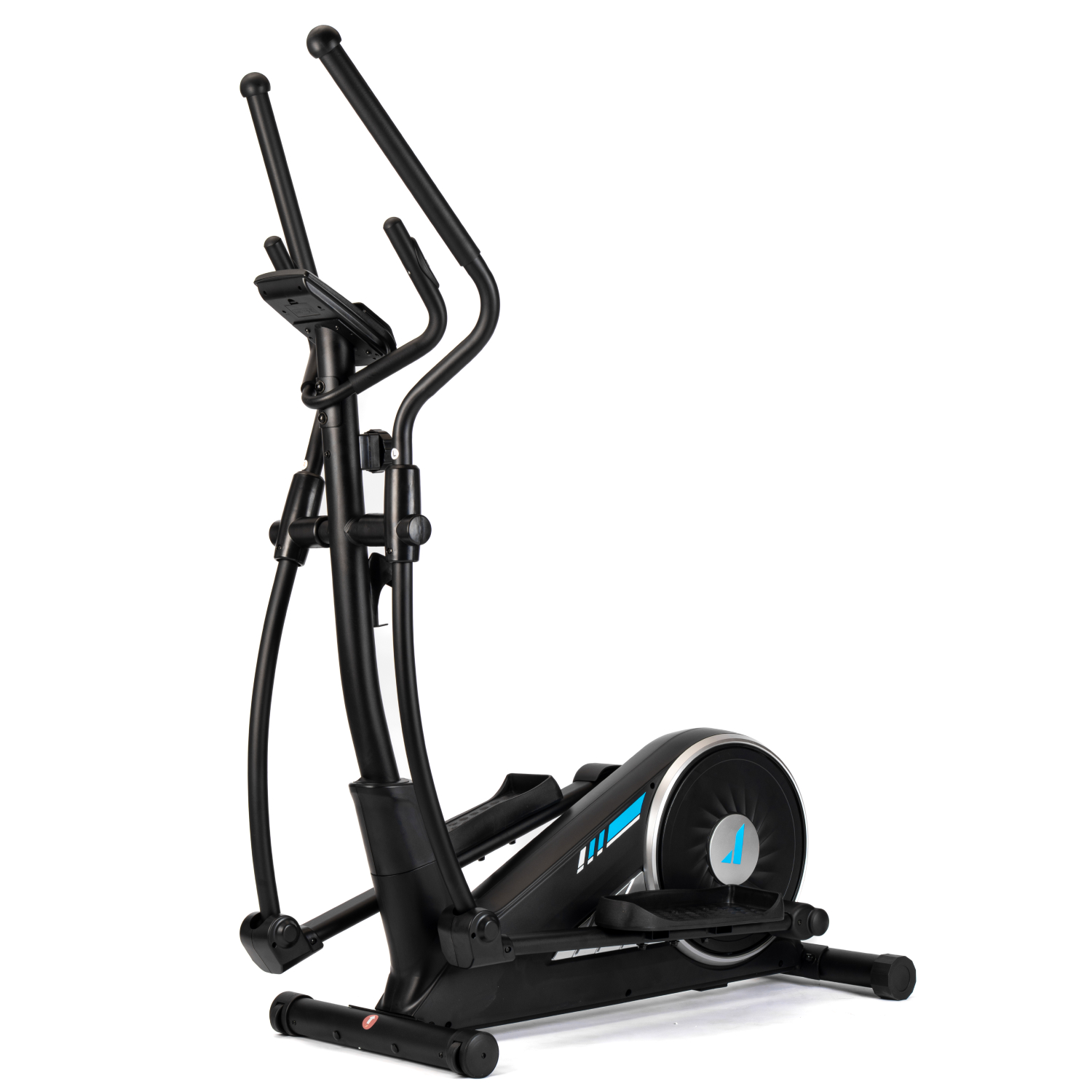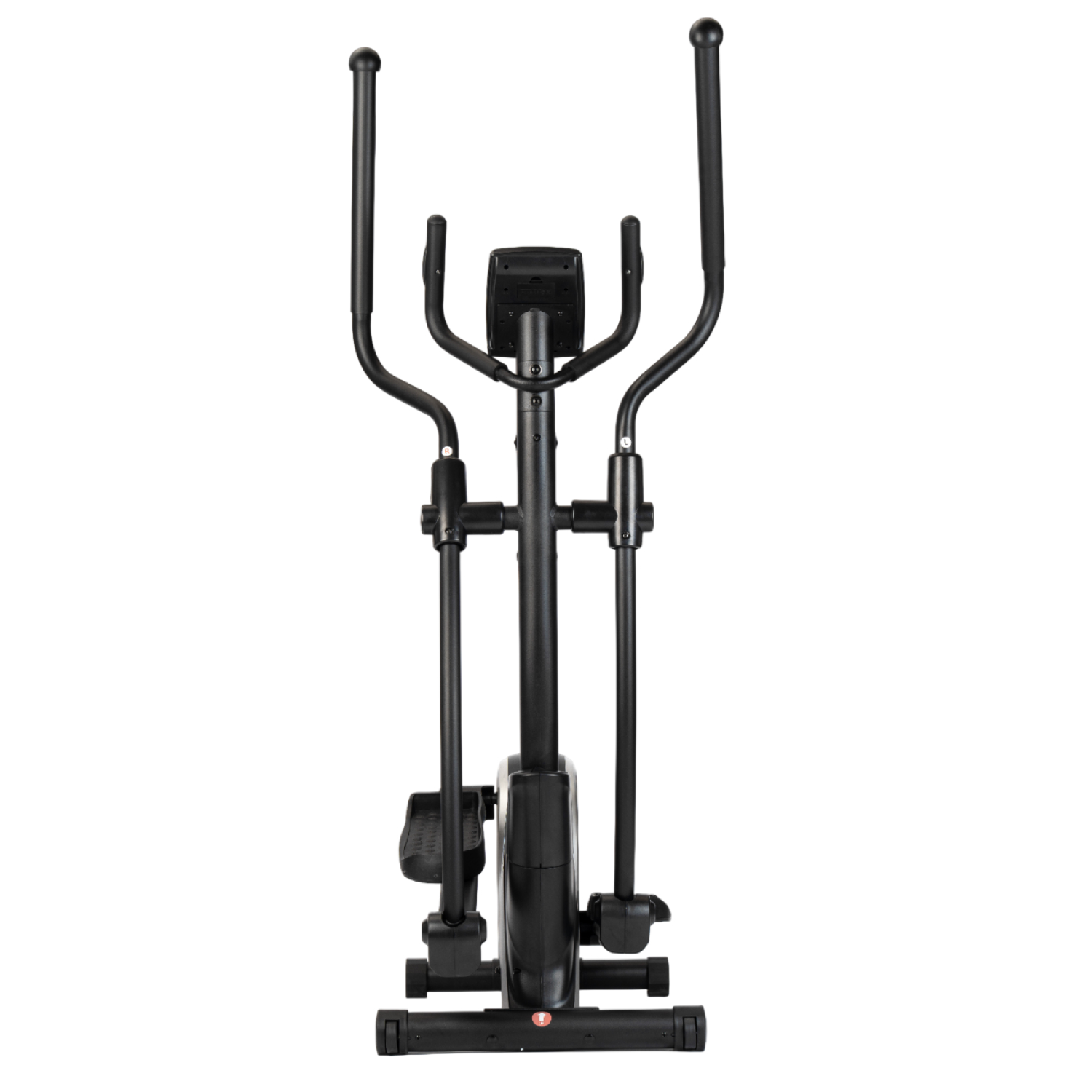 Тренажёр оснащён монохромным LCD-дисплеем, который отображает основные параметры тренировки: время, дистанцию, скорость, количество сожжённых калорий, пульс, общую дистанцию и режим сканирования. Для контроля состояния организма во время тренировки на поручнях установлены сенсорные датчики пульса. Дисплей работает от двух батареек типа AA (в комплект не входят). Эллипсоид стоит устойчиво благодаря компенсаторам неровности пола, легко перемещается на транспортировочных роликах, а подставка под планшет и держатель для бутылки держат всё необходимое под рукой.