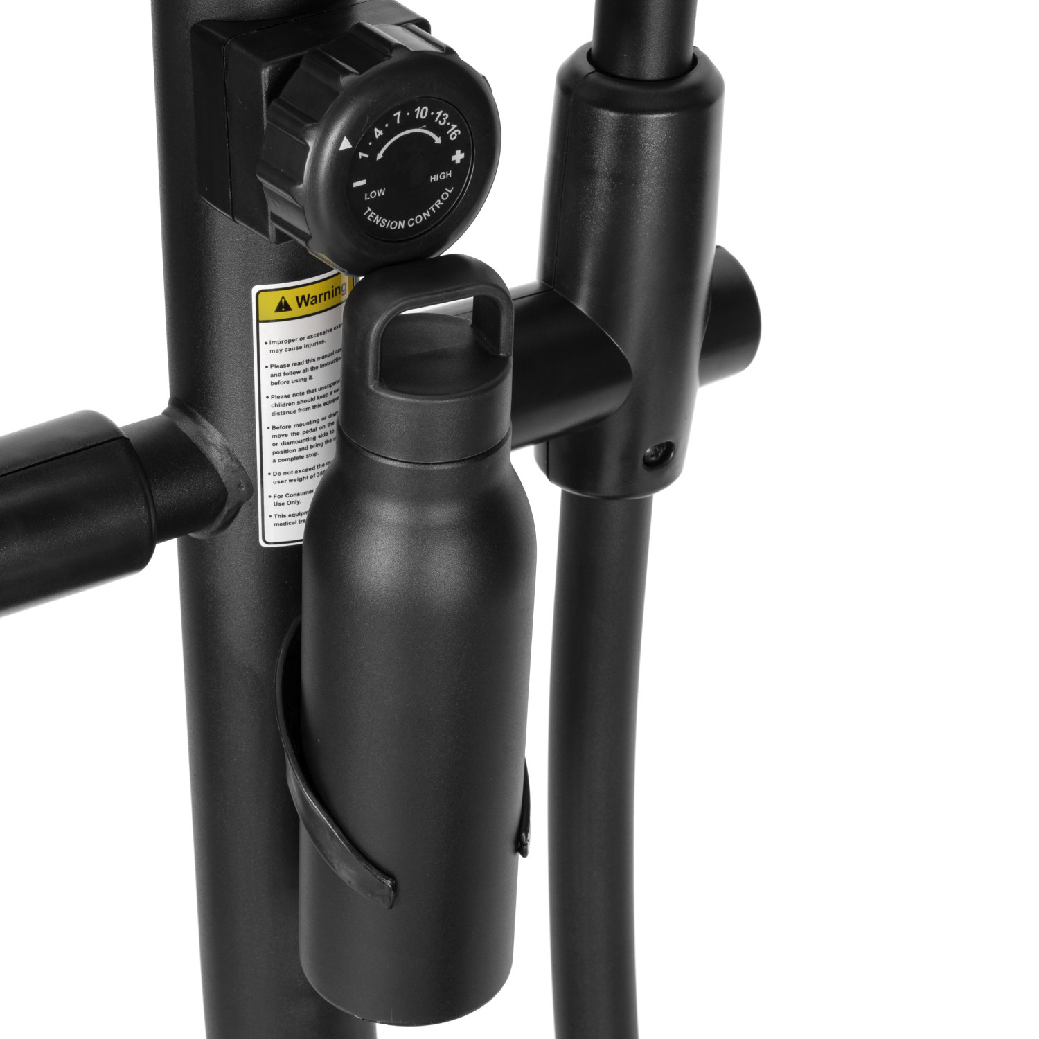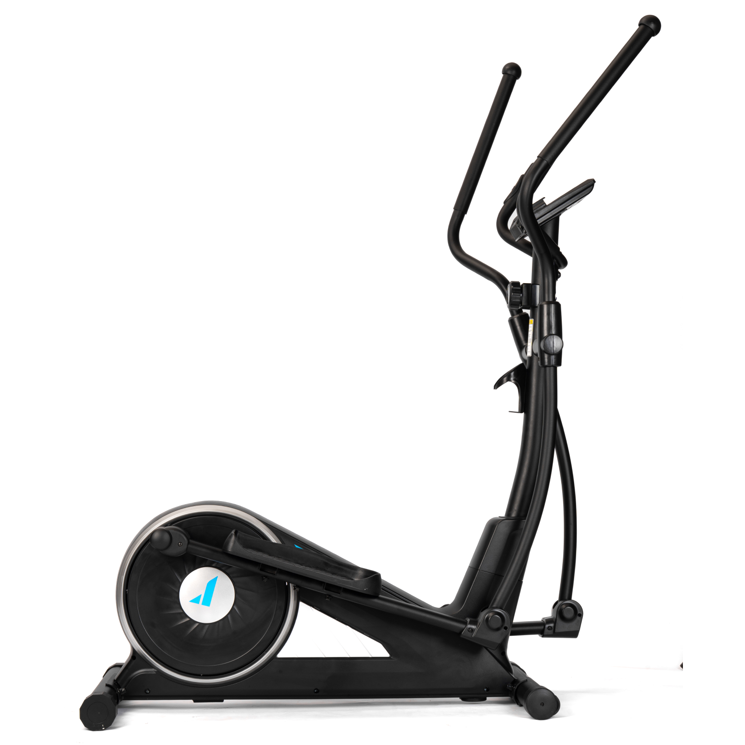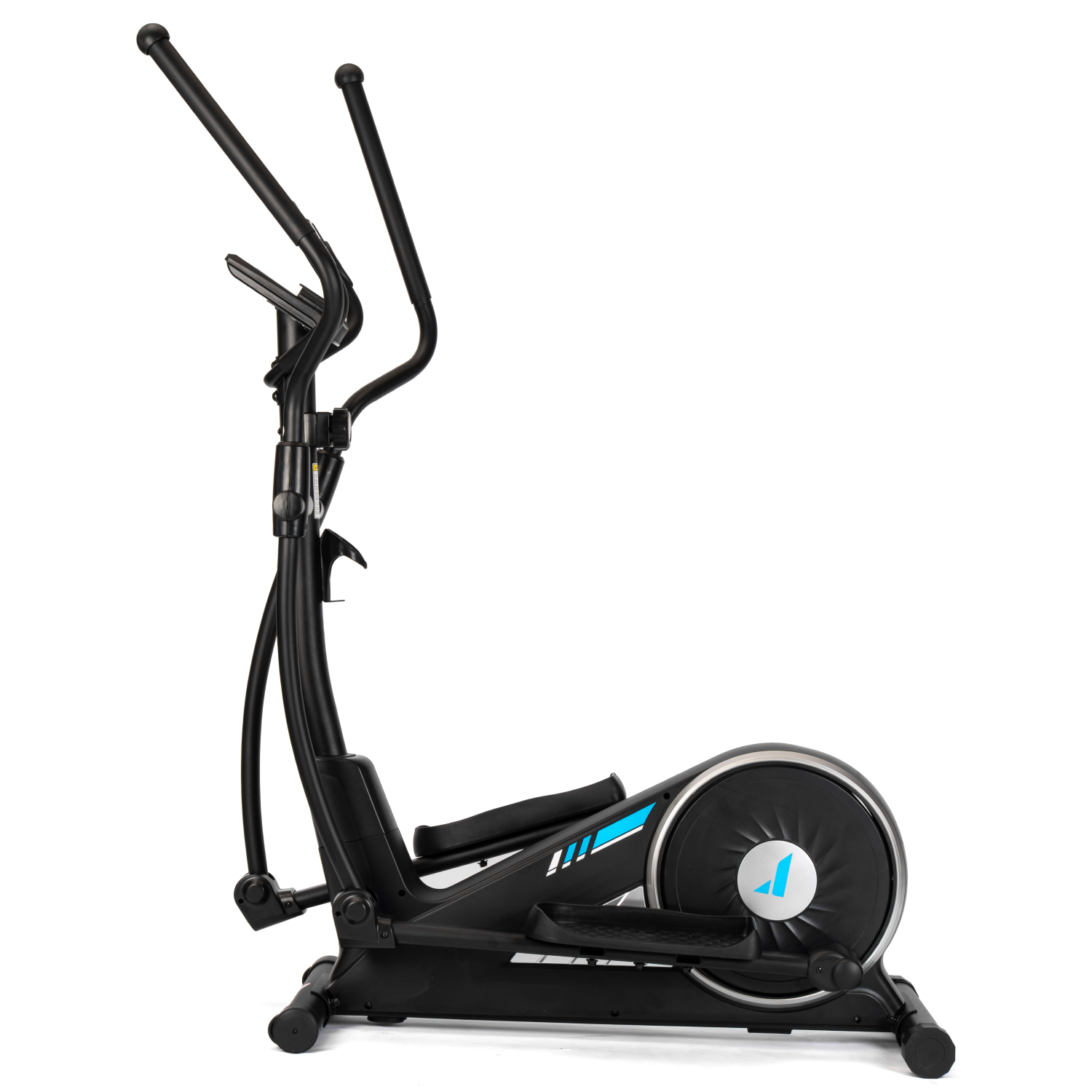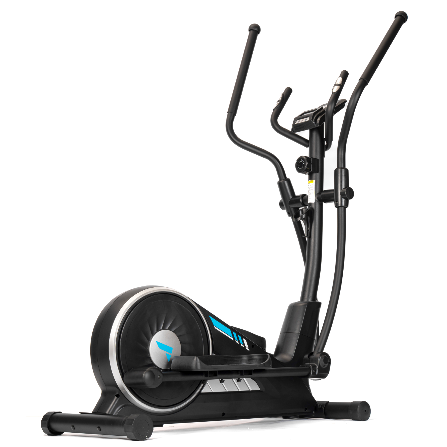 Тренажёр оснащён монохромным LCD-дисплеем, который отображает основные параметры тренировки: время, дистанцию, скорость, количество сожжённых калорий, пульс, общую дистанцию и режим сканирования. Для контроля состояния организма во время тренировки на поручнях установлены сенсорные датчики пульса. Дисплей работает от двух батареек типа AA (в комплект не входят). Эллипсоид стоит устойчиво благодаря компенсаторам неровности пола, легко перемещается на транспортировочных роликах, а подставка под планшет и держатель для бутылки держат всё необходимое под рукой.