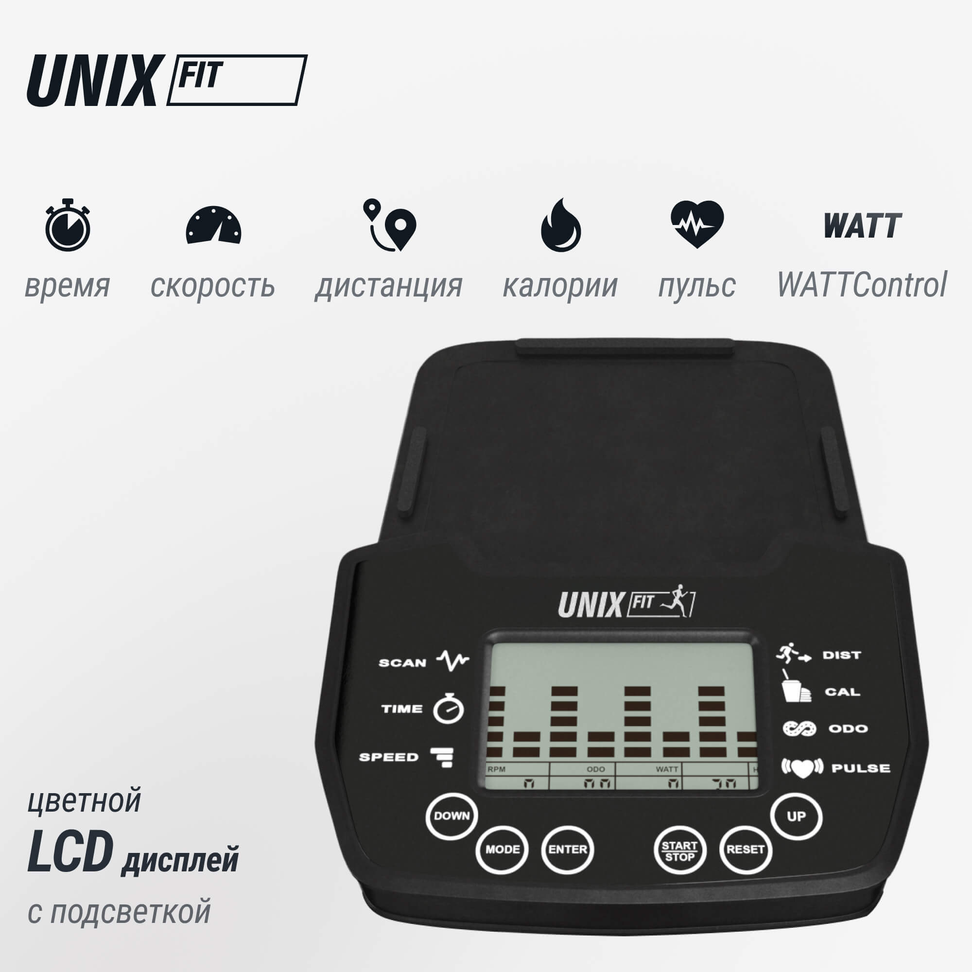 время, дистанция, пульс, калории, скорость, нагрузка в Ваттах